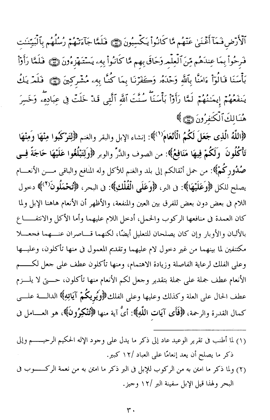 (اللهُ الَّذِي جَعَلَ لَكُمُ الْأَنْعَامَ): إنشاء الإبل والبقر والغنم (لِتَرْكَبُوا مِنْهَا وَمِنْهَا تَأكُلُونَ وَلَكُمْ فِيهَا مَنَافِعُ): من الصوف والدَّرِّ والوبر (وَلِتَبْلُغُوا عَلَيْهَا حَاجَةً فِي صُدُورِكُمْ): من حمل أثقالكم إلى بلد والغنم للأكل وله المنافع والباقي من الأنعام يصلح للكل (وَعَلَيْهَا): في البر، (وَعَلَى الْفلْكِ): في البحر، (تُحْمَلُونَ) دخول اللام في بعض دون بعض للفرق بين العين والمنفعة، والأظهر أن الأنعام هاهنا الإبل ولما كان العمدة في منافعها الركوب والحمل، أدخل اللام عليهما وأما الأكل والانتفاع بالألبان والأوبار وإن كان يصلحان للتعليل أيضًا، لكنهما قاصران عنهما فجعلا مكتنفين لما بينهما من غير دخول لام عليهما وتقديم المعمول في منها تأكلون، وعليها وعلى الفلك لرعاية الفاصلة وزيادة الاهتمام، ومنها تأكلون عطف على جعل لكم الأنعام عطف جملة على جملة بتقدير وجعل لكم الأنعام منها تأكلون، حتى لا يلزم عطف الحال على العلة وكذلك وعليها وعلى الفلك (وَيُرِيكُمْ آيَاتِهِ) الدالة على كمال القدرة والرحمة، (فَأَى آيَاتِ اللهِ): أي آية منها (تُنْكِرُونَ)، هو العامل في