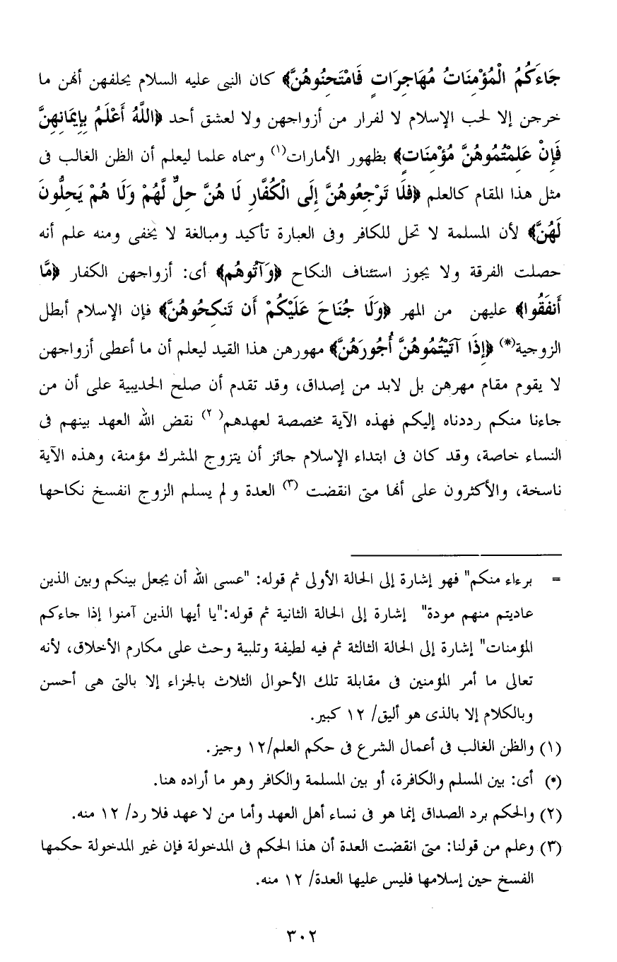 جَاءَكُمُ الْمُؤْمِنَاتُ مُهَاجِرَاتٍ فَامْتَحِنُوهُنَّ) كان النبي عليه السلام يحلفهن أنهن ما خرجن إلا لحب الإسلام لا لفرار من أزواجهن ولا لعشق أحد (اللهُ أَعْلَمُ بِإِيمَانِهِنَّ فَإِنْ عَلِمْتُمُوهُنَّ مُؤْمِنَاتٍ) بظهور الأمارات وسماه علما ليعلم أن الظن الغالب في مثل هذا المقام كالعلم (فَلَا تَرْجِعُوهُنَّ إِلَى الْكُفَّارِ لَا هُنَّ حِلٌّ لَهُمْ وَلَا هُمْ يَحِلُّونَ لَهُنَّ) لأن المسلمة لا تحل للكافر وفي العبارة تأكيد ومبالغة لا يخفى ومنه علم أنه حصلت الفرقة ولا يجوز استئناف النكاح (وَآتُوهُم) أي: أزواجهن الكفار (مَّا أَنفَقُوا) عليهن من المهر (وَلَا جُنَاحَ عَلَيْكُمْ أَن تَنكِحُوهُنَّ) فإن الإسلام أبطل الزوجية (إِذَا آتَيْتُمُوهُنَّ أُجُورَهُنَّ) مهورهن هذا القيد ليعلم أن ما أعطى أزواجهن لا يقوم مقام مهرهن بل لابد من إصداق، وقد تقدم أن صلح الحديبية على أن من جاءنا منكم رددناه إليكم فهذه الآية مخصصة لعهدهم نقض الله العهد بينهم في النساء خاصة، وقد كان في ابتداء الإسلام جائز أن يتزوج المشرك مؤمنة، وهذه الآية ناسخة، والأكثرون على أنها متى انقضت العدة ولم يسلم الزوج انفسخ نكاحها
