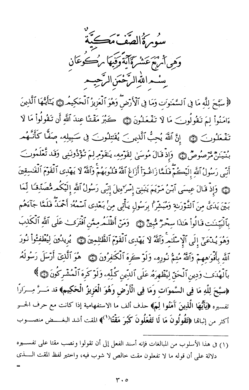 (سَبَّحَ لله مَا فِي السَّمَاوَاتِ وَمَا فِي الْأَرْضِ وَهُوَ الْعَزِيزُ الْحَكِيمُ (1) يَا أَيُّهَا الَّذِينَ آمَنُوا لِمَ تَقُولُونَ مَا لَا تَفْعَلُونَ (2) كَبُرَ مَقْتًا عِنْدَ اللهِ أَنْ تَقُولُوا مَا لَا تَفْعَلُونَ (3) إِنَّ اللهَ يُحِبُّ الَّذِينَ يُقَاتِلُونَ فِي سَبِيلِهِ صَفًّا كَأَنَّهُمْ بُنْيَانٌ مَرْصُوصٌ (4) وَإِذْ قَالَ مُوسَى لِقَوْمِهِ يَا قَوْمِ لِمَ تُؤْذُونَنِي وَقَدْ تَعْلَمُونَ أَنِّي رَسُولُ اللهِ إِلَيْكُمْ فَلَمَّا زَاغُوا أَزَاغَ اللهُ قُلُوبَهُمْ وَاللهُ لَا يَهْدِي الْقَوْمَ الْفَاسِقِينَ (5) وَإِذْ قَالَ عِيسَى ابْنُ مَرْيَمَ يَا بَنِي إِسْرَائِيلَ إِنِّي رَسُولُ اللهِ إِلَيْكُمْ مُصَدِّقًا لِمَا بَيْنَ يَدَيَّ مِنَ التَّوْرَاةِ وَمُبَشِّرًا بِرَسُولٍ يَأْتِي مِنْ بَعْدِي اسْمُهُ أَحْمَدُ فَلَمَّا جَاءَهُمْ بِالْبَيِّنَاتِ قَالُوا هَذَا سِحْرٌ مُبِينٌ (6) وَمَنْ أَظْلَمُ مِمَّنِ افْتَرَى عَلَى اللهِ الْكَذِبَ وَهُوَ يُدْعَى إِلَى الْإِسْلَامِ وَاللهُ لَا يَهْدِي الْقَوْمَ الظَّالِمِينَ (7) يُرِيدُونَ لِيُطْفِئُوا نُورَ اللهِ بِأَفْوَاهِهِمْ وَاللهُ مُتِمُّ نُورِهِ وَلَوْ كَرِهَ الْكَافِرُونَ (8) هُوَ الَّذِي أَرْسَلَ رَسُولَهُ بِالْهُدَى وَدِينِ الْحَقِّ لِيُظْهِرَهُ عَلَى الدِّينِ كُلِّهِ وَلَوْ كَرِهَ الْمُشْرِكُونَ (9)
