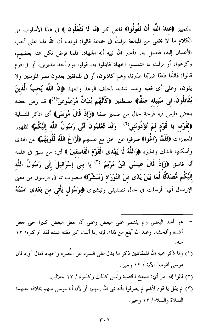 بالتمييز (عِنْدَ اللهِ أَنْ تَقُولُوا) فاعل كبر (مَا لَا تَفْعَلُونَ) في هذا الأسلوب من الكلام ما لا يخفى من المبالغة نزلت في جماعة قالوا: لوددنا أن الله دلنا على أحب الأعمال إليه، فنعمل به. فأخبر الله نبيه أنه الجهاد، فلما فرض نكل عنه بعضهم، وكرهوا، أو نزلت لما التمسوا الجهاد فابتلوا به، فولوا يوم أحد مدبرين، أو في قوم قالوا: قاتَلْنا طعنّا ضرَبّنا صَبرنا، وهم كاذبون، أو في المنافقين يعدون نصر المؤمنين ولا يفون، وعلى أي ففيه وعيد شديد لمخلف الوعد والعهد (إِنَّ اللهَ يُحِبُّ الَّذِينَ يُقَاتِلُونَ فِي سَبِيلِهِ صَفًّا) مصطفين (كَأَنَّهُمْ بُنْيَانٌ مَرْصُوصٌ) قد رص بعضه ببعض فليس فيه فرجة حال من ضمير صفا (وَإِذْ قَالَ مُوسَى) أي اذكر للتسلية (لِقَوْمِهِ يَا قَوْمِ لِمَ تُؤْذُونَنِي وَقَدْ تَعْلَمُونَ أَنِّي رَسُولُ اللهِ إِلَيْكُمْ) لظهور المعجزات (فَلَمَّا زَاغُوا) صرفوا عن الحق مع علمهم (أَزَاغَ اللهُ قُلُوبَهُمْ) عن الهدى وأسكنها الشك والحيرة (وَاللهُ لَا يَهْدِي الْقَوْمَ الْفَاسِقِينَ) أي: من سبق في علمه أنه فاسق (وَإِذْ قَالَ عِيسَى ابْنُ مَرْيَمَ يَا بَنِي إِسْرَائِيلَ إِنِّي رَسُولُ اللهِ إِلَيْكُمْ مُصَدِّقًا لِمَا بَيْنَ يَدَيَّ مِنَ التَّوْرَاةِ وَمُبَشِّرًا) منصوب بما في الرسول من معنى الإرسال أي: أرسلت في حال تصديقي وتبشيري (بِرَسُولٍ يَأْتِي مِنْ بَعْدِي اسْمُهُ