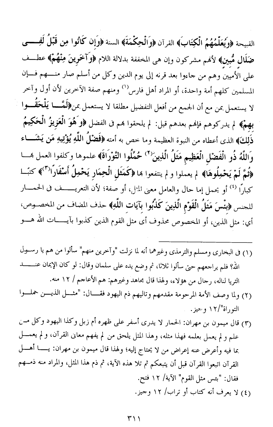 القبيحة (وَيُعَلِّمُهُمُ الْكِتَابَ) القرآن (وَالْحِكْمَةَ) السنة (وَإِن كَانُوا مِن قَبْلُ لَفِي ضَلَالٍ مبِينٍ) لأنهم مشركون وإن هي المخففة بدلالة اللام (وَآخَرِينَ مِنْهمْ) عطف على الأميين وهم من جاءوا بعد قرنه إلى يوم الدين وكل من أسلم صار منهم فإن المسلمين كلهم أمة واحدة، أو المراد أهل فارس ومنهم صفة الآخرين لأن أول وآخر لا يستعمل بمن مع أن الجمع من أفعل التفضيل مطلقًا لا يستعمل بمن (لَمَّا يَلْحَقُوا بِهِمْ) لم يدركوهم فإنهم بعدهم قيل: لم يلحقوا بهم في الفضل (وَهُوَ الْعَزِيزُ الْحَكِيمُ ذلِكَ) الذي أعطاه من النبوة العظيمة وما خص به أمته (فَضْلُ اللهِ يُؤْتِيهِ مَن يَشَاء وَاللهُ ذُو الْفَضْلِ الْعَظِيمِ مَثَلُ الَّذِينَ حُمِّلُوا التَّوْرَاةَ) علموها وكلفوا العمل بها (ثُمَّ لَمْ يَحْمِلُوهَا) لم يعملوا ولم ينتفعوا بها (كَمَثَلِ الْحِمَارِ يَحْمِلُ أَسْفَارًا) كتبًا كبارًا أو يحمل إما حال والعامل معنى المثل، أو صفة؛ لأن التعريف في الحمار للجنس (بِئْسَ مَثَلُ الْقَوْمِ الَّذِينَ كَذَّبُوا بِآيَاتِ اللهِ) حذف المضاف من المخصوص، أي: مثل الذين، أو المخصوص محذوف أي مثل القوم الذين كذبوا بآيات الله هو