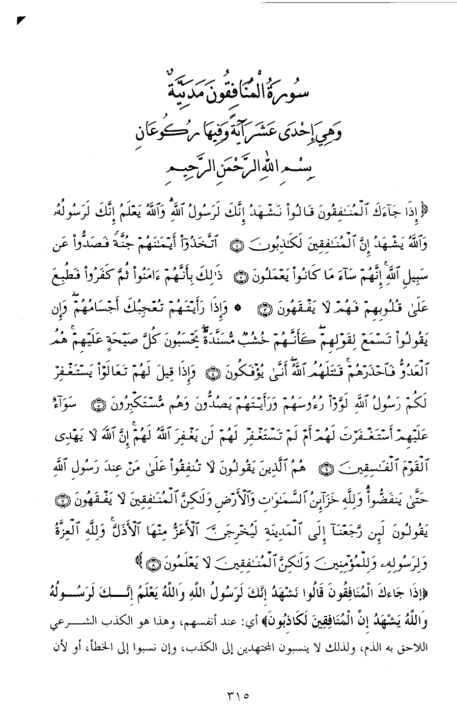 (إِذَا جَاءَكَ الْمُنَافِقُونَ قَالُوا نَشْهَدُ إِنَّكَ لَرَسُولُ اللهِ وَاللهُ يَعْلَمُ إِنَّكَ لَرَسُولُهُ وَاللهُ يَشْهَدُ إِنَّ الْمُنَافِقِينَ لَكَاذِبُونَ (1) اتَّخَذُوا أَيْمَانَهُمْ جُنَّةً فَصَدُّوا عَنْ سَبِيلِ اللهِ إِنَّهُمْ سَاءَ مَا كَانُوا يَعْمَلُونَ (2) ذَلِكَ بِأَنَّهُمْ آمَنُوا ثُمَّ كَفَرُوا فَطُبِعَ عَلَى قُلُوبِهِمْ فَهُمْ لَا يَفْقَهُونَ (3) وَإِذَا رَأَيْتَهُمْ تُعْجِبُكَ أَجْسَامُهُمْ وَإِنْ يَقُولُوا تَسْمَعْ لِقَوْلِهِمْ كَأَنَّهُمْ خُشُبٌ مُسَنَّدَةٌ يَحْسَبُونَ كُلَّ صَيْحَةٍ عَلَيْهِمْ هُمُ الْعَدُوُّ فَاحْذَرْهُمْ قَاتَلَهُمُ اللهُ أَنَّى يُؤْفَكُونَ (4) وَإِذَا قِيلَ لَهُمْ تَعَالَوْا يَسْتَغْفِرْ لَكُمْ رَسُولُ اللهِ لَوَّوْا رُءُوسَهُمْ وَرَأَيْتَهُمْ يَصُدُّونَ وَهُمْ مُسْتَكْبِرُونَ (5) سَوَاءٌ عَلَيْهِمْ أَسْتَغْفَرْتَ لَهُمْ أَمْ لَمْ تَسْتَغْفِرْ لَهُمْ لَنْ يَغْفِرَ اللهُ لَهُمْ إِنَّ اللهَ لَا يَهْدِي الْقَوْمَ الْفَاسِقِينَ (6) هُمُ الَّذِينَ يَقُولُونَ لَا تُنْفِقُوا عَلَى مَنْ عِنْدَ رَسُولِ اللهِ حَتَّى يَنْفَضُّوا وَلله خَزَائِنُ السَّمَاوَاتِ وَالْأَرْضِ وَلَكِنَّ الْمُنَافِقِينَ لَا يَفْقَهُونَ (7) يَقُولُونَ لَئِنْ رَجَعْنَا إِلَى الْمَدِينَةِ لَيُخْرِجَنَّ الْأَعَزُّ مِنْهَا الْأَذَلَّ وَلله الْعِزَّةُ وَلِرَسُولِهِ وَلِلْمُؤْمِنِينَ وَلَكِنَّ الْمُنَافِقِينَ لَا يَعْلَمُونَ (8)