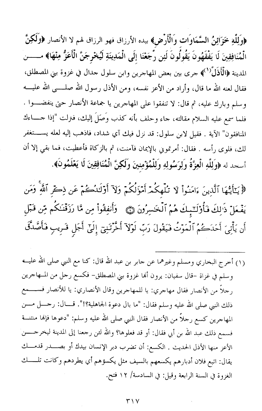 (وَلله خَزَائِنُ السَّمَاوَاتِ وَالْأَرْضِ) بيده الأرزاق فهو الرزاق لهم لا الأنصار (وَلَكِنَّ الْمُنَافِقِينَ لَا يَفْقَهُونَ يَقُولُونَ لَئِنْ رَجَعْنَا إِلَى الْمَدِينَةِ لَيُخْرِجَنَّ الْأَعَزُّ مِنْهَا) من المدينة (الْأَذَلَّ) جرى بين بعض المهاجرين وابن سلول جدال في غزوة بني المصطلق، فقال لعنه الله ما قال، وأراد من الأعز نفسه، ومن الأذل رسول الله صلى الله عليه وسلم وبارك عليه، ثم قال: لا تنفقوا على المهاجرين يا جماعة الأنصار حتى ينفضوا. فلما سمع عليه السلام مقالته، جاء وحلف بأنه كذبٌ وَصَلَ إليك، فنزلت " إذا جاءك المنافقون " الآية. فقيل لابن سلول: قد نزل فيك آي شداد، فاذهب إليه لعله يستغفر لك، فلوى رأسه. فقال: أمرتموني بالإيمان فآمنت، ثم بالزكاة فأعطيت، فما بقي إلا أن أسجد له (وَلله الْعِزَّةُ وَلِرَسُولِهِ وَلِلْمُؤْمِنِينَ وَلَكِنَّ الْمُنَافِقِينَ لَا يَعْلَمُونَ).