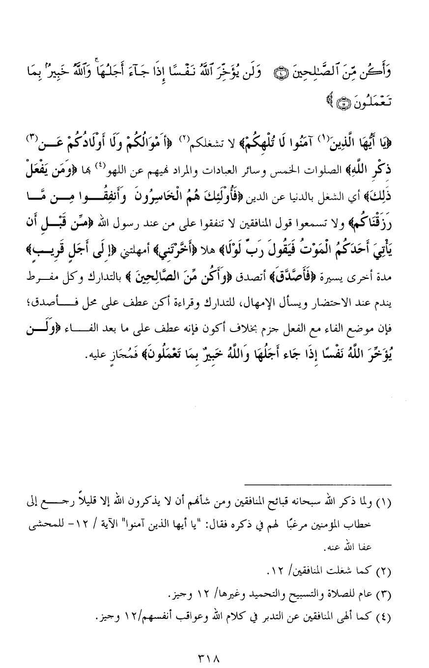 (يَا أَيُّهَا الَّذِينَ آمَنُوا لَا تُلْهِكُمْ) لا تشغلكم (أَمْوَالُكُمْ وَلَا أَوْلَادُكُمْ عَنْ ذِكْرِ اللهِ) الصلوات الخمس وسائر العبادات والمراد نهيهم عن اللهو بها (وَمَنْ يَفْعَلْ ذَلِكَ) أي الشغل بالدنيا عن الدين (فَأُولَئِكَ هُمُ الْخَاسِرُونَ وَأَنْفِقُوا مِنْ مَا رَزَقْنَاكُمْ) ولا تسمعوا قول المنافقين لا تنفقوا على من عند رسول الله (مِنْ قَبْلِ أَنْ يَأْتِيَ أَحَدَكُمُ الْمَوْتُ فَيَقُولَ رَبِّ لَوْلَا) هلا (أَخَّرْتَنِي) أمهلتني (إِلَى أَجَلٍ قَرِيبٍ) مدة أخرى يسيرة (فَأَصَّدَّقَ) أتصدق (وَأَكُنْ مِنَ الصَّالِحِينَ) بالتدارك وكل مفرط يندم عند الاحتضار ويسأل الإمهال، للتدارك وقراءة أكن عطف على محل (فَأَصَّدَّقَ)؛ فإن موضع الفاء مع الفعل جزم بخلاف أكون فإنه عطف على ما بعد الفاء (وَلَنْ يُؤَخِّرَ اللهُ نَفْسًا إِذَا جَاءَ أَجَلُهَا وَاللهُ خَبِيرٌ بِمَا تَعْمَلُونَ) فَمُجَازٍ عليه.