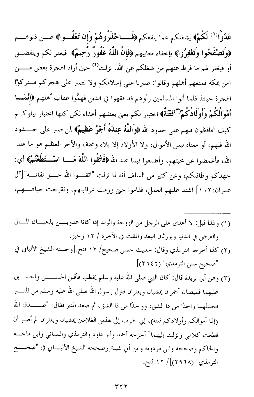 عَدُوًّا لَكُمْ) يشغلكم عما ينفعكم (فَاحْذَرُوهُمْ وَإِنْ تَعْفُوا) عن ذنوبهم (وَتَصْفَحُوا وَتَغْفِرُوا) بإخفاء معايبهم (فَإِنَّ اللهَ غَفُورٌ رَحِيمٌ) فيغفر لكم ويتفضل أو فيغفر لهم ما فرط عنهم من شغلكم عن الله. نزلت حين أراد الهجرة بعض من آمن بمكة فمنعهم أهلهم وقالوا: صبرنا على إسلامكم ولا نصبر على هجركم فتركوا الهجرة حينئذ فلما أتوا المسلمين رأوهم قد فقهوا في الدين فهمُّوا عقاب أهلهم (إِنَّمَا أمْوَالُكُمْ وَأَوْلَادُكُمْ فِتْنَةٌ) اختبار لكم يعني بعضهم أعداء لكن كلها اختبار يبلوكم كيف تحافظون فيهم على حدود الله (وَاللهُ عِنْدَهُ أَجْرٌ عَظِيمٌ) لمن صبر على حدود الله فيهم، أو معناه ليس الأموال، ولا الأولاد إلا بلاء ومحنة، والأجر العظيم هو ما عند الله، فأغمضوا عن محبتهم، واطمعوا فيما عند الله (فَاتَّقُوا اللهَ مَا اسْتَطَعتُمْ) أي: جهدكم وطاقتكم، وعن كثير من السلف أنه لما نزلت (اتَّقُوا اللهَ حَقَّ تُقَاتِهِ) [آل عمران: 102] اشتد عليهم العمل، فقاموا حتى ورمت عراقيبهم، وتقرحت جباههم،