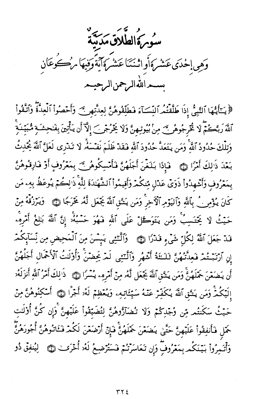 (يَا أَيُّهَا النَّبِيُّ إِذَا طَلَّقْتُمُ النِّسَاءَ فَطَلِّقُوهُنَّ لِعِدَّتِهِنَّ وَأَحْصُوا الْعِدَّةَ وَاتَّقُوا اللهَ رَبَّكُمْ لَا تُخْرِجُوهُنَّ مِنْ بُيُوتِهِنَّ وَلَا يَخْرُجْنَ إِلَّا أَنْ يَأْتِينَ بِفَاحِشَةٍ مُبَيِّنَةٍ وَتِلْكَ حُدُودُ اللهِ وَمَنْ يَتَعَدَّ حُدُودَ اللهِ فَقَدْ ظَلَمَ نَفْسَهُ لَا تَدْرِي لَعَلَّ اللهَ يُحْدِثُ بَعْدَ ذَلِكَ أَمْرًا (1) فَإِذَا بَلَغْنَ أَجَلَهُنَّ فَأَمْسِكُوهُنَّ بِمَعْرُوفٍ أَوْ فَارِقُوهُنَّ بِمَعْرُوفٍ وَأَشْهِدُوا ذَوَيْ عَدْلٍ مِنْكُمْ وَأَقِيمُوا الشَّهَادَةَ لله ذَلِكُمْ يُوعَظُ بِهِ مَنْ كَانَ يُؤْمِنُ بِاللهِ وَالْيَوْمِ الْآخِرِ وَمَنْ يَتَّقِ اللهَ يَجْعَلْ لَهُ مَخْرَجًا (2) وَيَرْزُقْهُ مِنْ حَيْثُ لَا يَحْتَسِبُ وَمَنْ يَتَوَكَّلْ عَلَى اللهِ فَهُوَ حَسْبُهُ إِنَّ اللهَ بَالِغُ أَمْرِهِ قَدْ جَعَلَ اللهُ لِكُلِّ شَيْءٍ قَدْرًا (3) وَاللَّائِي يَئِسْنَ مِنَ الْمَحِيضِ مِنْ نِسَائِكُمْ إِنِ ارْتَبْتُمْ فَعِدَّتُهُنَّ ثَلَاثَةُ أَشْهُرٍ وَاللَّائِي لَمْ يَحِضْنَ وَأُولَاتُ الْأَحْمَالِ أَجَلُهُنَّ أَنْ يَضَعْنَ حَمْلَهُنَّ وَمَنْ يَتَّقِ اللهَ يَجْعَلْ لَهُ مِنْ أَمْرِهِ يُسْرًا (4) ذَلِكَ أَمْرُ اللهِ أَنْزَلَهُ إِلَيْكُمْ وَمَنْ يَتَّقِ اللهَ يُكَفِّرْ عَنْهُ سَيِّئَاتِهِ وَيُعْظِمْ لَهُ أَجْرًا (5) أَسْكِنُوهُنَّ مِنْ حَيْثُ سَكَنْتُمْ مِنْ وُجْدِكُمْ وَلَا تُضَارُّوهُنَّ لِتُضَيِّقُوا عَلَيْهِنَّ وَإِنْ كُنَّ أُولَاتِ حَمْلٍ فَأَنْفِقُوا عَلَيْهِنَّ حَتَّى يَضَعْنَ حَمْلَهُنَّ فَإِنْ أَرْضَعْنَ لَكُمْ فَآتُوهُنَّ أُجُورَهُنَّ وَأْتَمِرُوا بَيْنَكُمْ بِمَعْرُوفٍ وَإِنْ تَعَاسَرْتُمْ فَسَتُرْضِعُ لَهُ أُخْرَى (6) لِيُنْفِقْ ذُو
