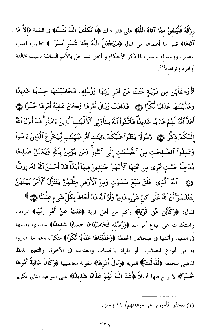 (وَكَأَيِّنْ مِنْ قَرْيَةٍ عَتَتْ عَنْ أَمْرِ رَبِّهَا وَرُسُلِهِ فَحَاسَبْنَاهَا حِسَابًا شَدِيدًا وَعَذَّبْنَاهَا عَذَابًا نُكْرًا (8) فَذَاقَتْ وَبَالَ أَمْرِهَا وَكَانَ عَاقِبَةُ أَمْرِهَا خُسْرًا (9) أَعَدَّ اللهُ لَهُمْ عَذَابًا شَدِيدًا فَاتَّقُوا اللهَ يَا أُولِي الْأَلْبَابِ الَّذِينَ آمَنُوا قَدْ أَنْزَلَ اللهُ إِلَيْكُمْ ذِكْرًا (10) رَسُولًا يَتْلُو عَلَيْكُمْ آيَاتِ اللهِ مُبَيِّنَاتٍ لِيُخْرِجَ الَّذِينَ آمَنُوا وَعَمِلُوا الصَّالِحَاتِ مِنَ الظُّلُمَاتِ إِلَى النُّورِ وَمَنْ يُؤْمِنْ بِاللهِ وَيَعْمَلْ صَالِحًا يُدْخِلْهُ جَنَّاتٍ تَجْرِي مِنْ تَحْتِهَا الْأَنْهَارُ خَالِدِينَ فِيهَا أَبَدًا قَدْ أَحْسَنَ اللهُ لَهُ رِزْقًا (11) اللهُ الَّذِي خَلَقَ سَبْعَ سَمَاوَاتٍ وَمِنَ الْأَرْضِ مِثْلَهُنَّ يَتَنَزَّلُ الْأَمْرُ بَيْنَهُنَّ لِتَعْلَمُوا أَنَّ اللهَ عَلَى كُلِّ شَيْءٍ قَدِيرٌ وَأَنَّ اللهَ قَدْ أَحَاطَ بِكُلِّ شَيْءٍ عِلْمًا (12)