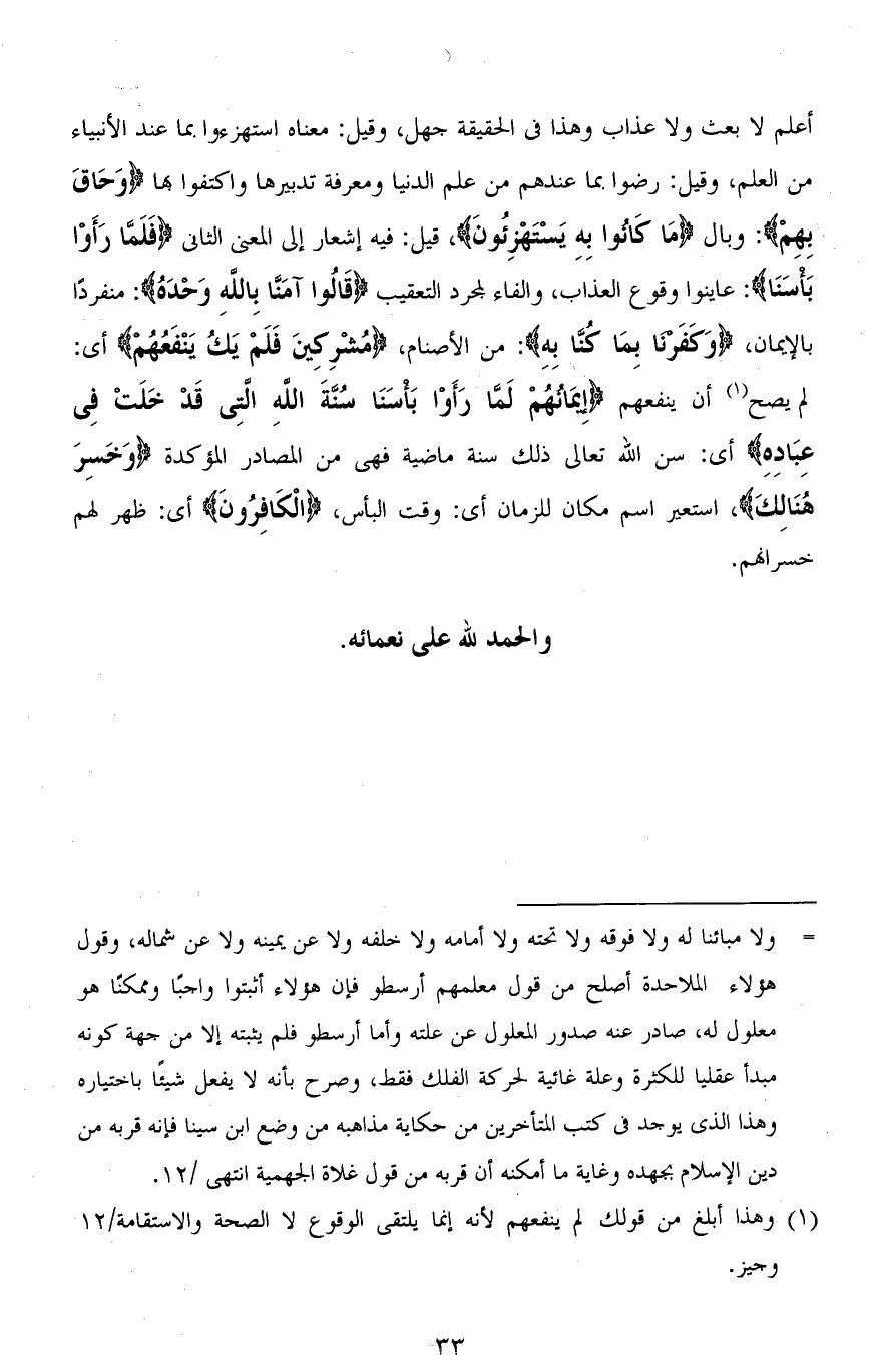 أعلم لا بعث ولا عذاب وهذا في الحقيقة جهل، وقيل: معناه استهزءوا بما عند الأنبياء من العلم، وقيل: رضوا بما عندهم من علم الدنيا ومعرفة تدبيرها واكتفوا بها (وَحَاقَ بِهِمْ): وبال (مَا كَانُوا بِهِ يَسْتَهْزِءُونَ)، قيل: فيه إشعار إلى المعنى الثاني (فَلَمَّا رَأَوْا بَأْسَنَا): عاينوا وقوع العذاب، والفاء لمجرد التعقيب (قَالُوا آمَنَّا بِاللهِ وَحْدَهُ): منفردًا بالإيمان، (وَكَفَرْنَا بِمَا كُنَّا بِهِ): من الأصنام، (مُشْرِكِينَ فَلَمْ يَكُ يَنْفَعُهُمْ) أي: لم يصح أن ينفعهم (إِيمَانُهُمْ لَمَّا رَأَوْا بَأْسَنَا سُنَّتَ اللهِ الَّتِي قَدْ خَلَتْ فِي عِبَادِهِ) أي: سنَّ الله تعالى ذلك سنة ماضية فهي من المصادر المؤكدة (وَخَسِرَ هُنَالِكَ)، استعير اسم مكان للزمان أي: وقت البأس، (الْكَافِرُونَ) أي: ظهر لهم خسرانهم.
