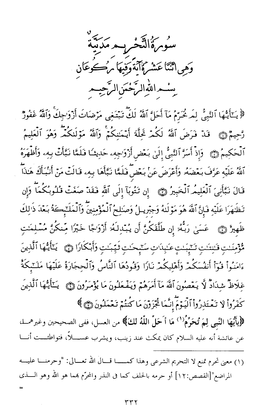 (يَا أَيُّهَا النَّبِيُّ لِمَ تُحَرِّمُ مَا أَحَلَّ اللهُ لَكَ تَبْتَغِي مَرْضَاتَ أَزْوَاجِكَ وَاللهُ غَفُورٌ رَحِيمٌ (1) قَدْ فَرَضَ اللهُ لَكُمْ تَحِلَّةَ أَيْمَانِكُمْ وَاللهُ مَوْلَاكُمْ وَهُوَ الْعَلِيمُ الْحَكِيمُ (2) وَإِذْ أَسَرَّ النَّبِيُّ إِلَى بَعْضِ أَزْوَاجِهِ حَدِيثًا فَلَمَّا نَبَّأَتْ بِهِ وَأَظْهَرَهُ اللهُ عَلَيْهِ عَرَّفَ بَعْضَهُ وَأَعْرَضَ عَنْ بَعْضٍ فَلَمَّا نَبَّأَهَا بِهِ قَالَتْ مَنْ أَنْبَأَكَ هَذَا قَالَ نَبَّأَنِيَ الْعَلِيمُ الْخَبِيرُ (3) إِنْ تَتُوبَا إِلَى اللهِ فَقَدْ صَغَتْ قُلُوبُكُمَا وَإِنْ تَظَاهَرَا عَلَيْهِ فَإِنَّ اللهَ هُوَ مَوْلَاهُ وَجِبْرِيلُ وَصَالِحُ الْمُؤْمِنِينَ وَالْمَلَائِكَةُ بَعْدَ ذَلِكَ ظَهِيرٌ (4) عَسَى رَبُّهُ إِنْ طَلَّقَكُنَّ أَنْ يُبْدِلَهُ أَزْوَاجًا خَيْرًا مِنْكُنَّ مُسْلِمَاتٍ مُؤْمِنَاتٍ قَانِتَاتٍ تَائِبَاتٍ عَابِدَاتٍ سَائِحَاتٍ ثَيِّبَاتٍ وَأَبْكَارًا (5) يَا أَيُّهَا الَّذِينَ آمَنُوا قُوا أَنْفُسَكُمْ وَأَهْلِيكُمْ نَارًا وَقُودُهَا النَّاسُ وَالْحِجَارَةُ عَلَيْهَا مَلَائِكَةٌ غِلَاظٌ شِدَادٌ لَا يَعْصُونَ اللهَ مَا أَمَرَهُمْ وَيَفْعَلُونَ مَا يُؤْمَرُونَ (6) يَا أَيُّهَا الَّذِينَ كَفَرُوا لَا تَعْتَذِرُوا الْيَوْمَ إِنَّمَا تُجْزَوْنَ مَا كُنْتُمْ تَعْمَلُونَ (7)
