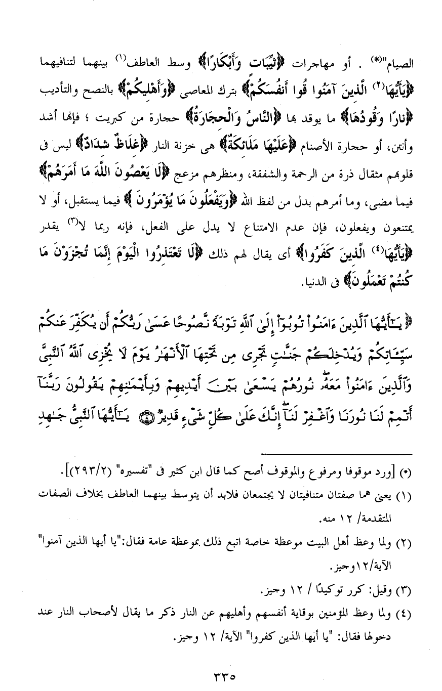 الصيام ". أو مهاجرات (ثَيِّبَاتٍ وَأَبْكَارًا) وسط العاطف بينهما لتنافيهما (يَا أَيُّهَا الَّذِينَ آمَنُوا قُوا أَنفُسَكُمْ) بترك المعاصي (وَأَهْلِيكُمْ) بالنصح والتأديب (نارًا وَقودُهَا) ما يوقد بها (النَّاسُ وَالْحِجَارَةُ) حجارة من كبريت؛ فإنها أشد وأنتن، أو حجارة الأصنام (عَلَيْهَا مَلَائِكَةٌ) هي خزنة النار (غِلَاظٌ شِدَادٌ) ليس في قلوبهم مثقال ذرة من الرحمة والشفقة، ومنظرهم مزعج (لَا يَعْصُونَ اللهَ مَا أَمَرَهُمْ) فيما مضى، وما أمرهم بدل من لفظ الله (وَيَفْعَلُونَ مَا يُؤْمَرُونَ) فيما يستقبل، أو لا يمتنعون ويفعلون، فإن عدم الامتناع لا يدل على الفعل، فإنه ربما لا يقدر (يَا أَيُّهَا الَّذِينَ كَفَرُوا) أي يقال لهم ذلك (لَا تَعْتَذِرُوا الْيَوْمَ إِنَّمَا تُجْزَوْنَ مَا كُنْتُمْ تَعْمَلُونَ) في الدنيا.