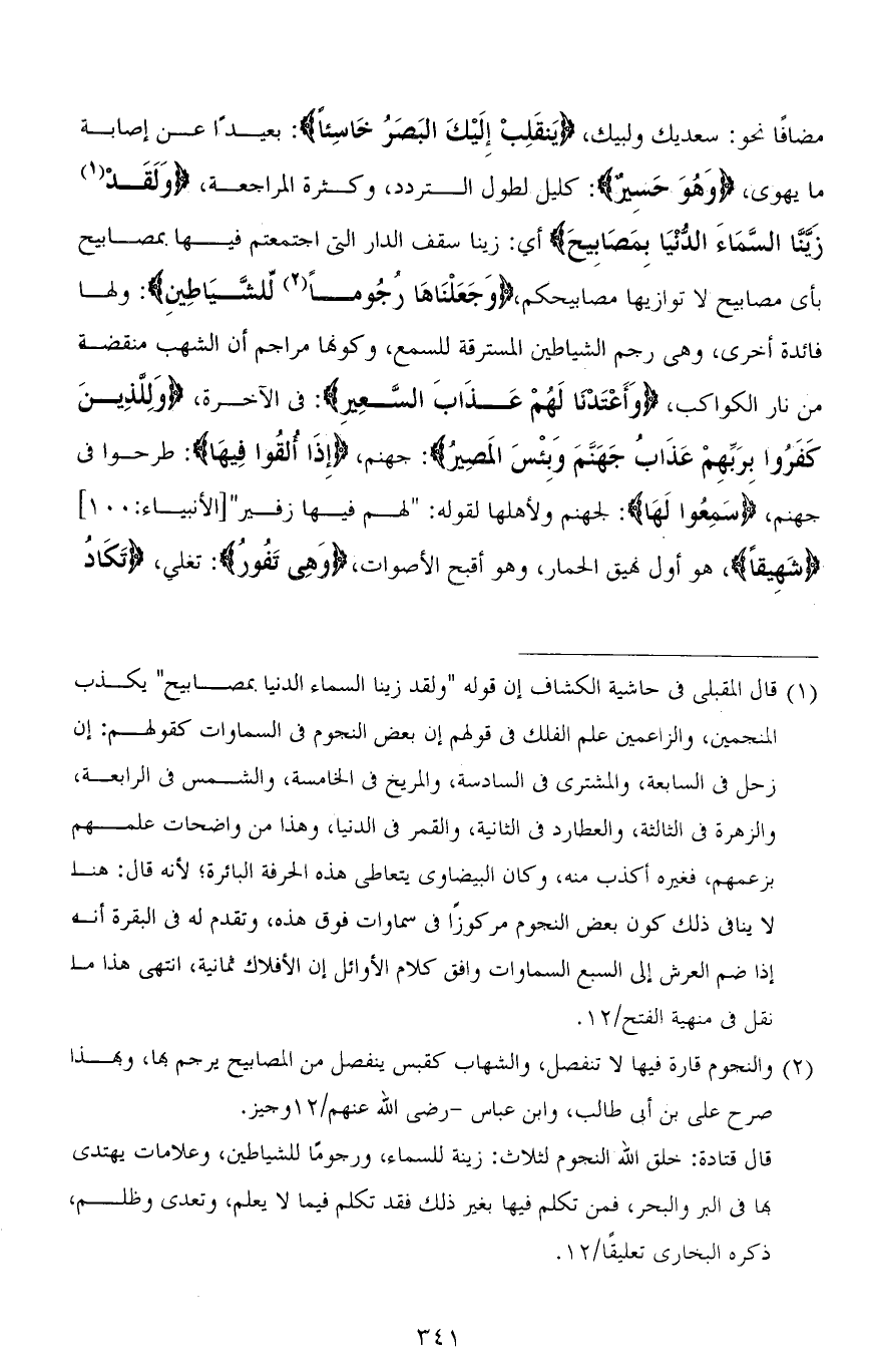 مضافًا نحو: سعديك ولبيك، (يَنْقَلِبْ إِلَيْكَ الْبَصَرُ خَاسِئًا): بعيدًا عن إصابة ما يهوى، (وَهُوَ حَسِيرٌ): كليل لطول التردد، وكثرة المراجعة، (وَلَقَدْ زَيَّنَّا السَّمَاءَ الدُّنْيَا بِمَصَابِيحَ) أي: زينا سقف الدار التي اجتمعتم فيها بمصابيح بأي مصابيح لا توازيها مصابيحكم، (وَجَعَلْنَاهَا رُجُومًا لِلشَّيَاطِينِ): ولها فائدة أخرى، وهي رجم الشياطين المسترقة للسمع، وكونها مراجم أن الشهب منقضة من نار الكواكب، (وَأَعْتَدْنَا لَهُمْ عَذَابَ السَّعِيرِ): في الآخرة، (وَلِلَّذِينَ كَفَرُوا بِرَبِّهِمْ عَذَابُ جَهَنَّمَ وَبِئْسَ الْمَصِيرُ): حهنم، (إِذَا أُلْقُوا فِيهَا): طرحوا في جهنم، (سَمِعُوا لَهَا): لجهنم ولأهلها لقوله: (لهم فيها زفير) [الأنبيا: 100] (شَهِيقًا)، هو أول نهيق الحمار، وهو أقبح الأصوات، (وَهِى تَفُورُ): تغلي، (تَكَادُ