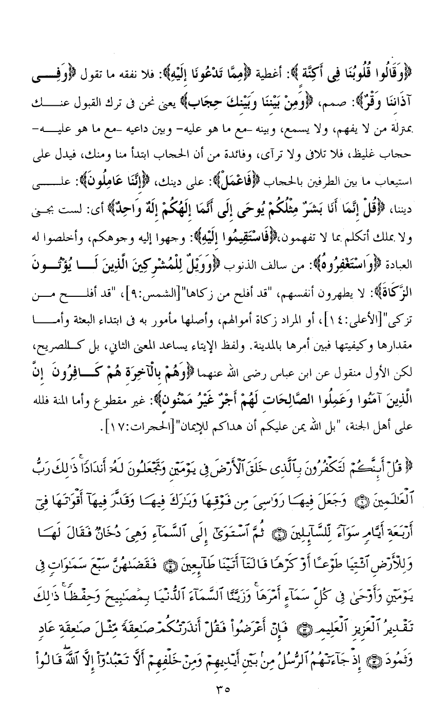 (وَقَالُوا قُلُوبُنَا فِي أَكِنَّةٍ): أغطية (مِمَّا تَدْعُونَا إِلَيْهِ): فلا نفقه ما تقول (وَفِي آذَانِنَا وَقْرٌ): صمم، (وَمِنْ بَيْنِنَا وَبَيْنِكَ حِجَاب) يعني نحن في ترك القبول عنك بمنزلة من لا يفهم، ولا يسمع، وبينه -مع ما هو عليه- وبين داعيه -مع ما هو عليه- حجاب غليظ، فلا تلافى ولا ترآى، وفائدة من أن الحجاب ابتدأ منا ومنك، فيدل على استيعاب ما بين الطرفين بالحجاب (فاعْمَلْ): على دينك، (إِنَّنَا عَامِلُونَ): على ديننا، (قُلْ إِنَّمَا أَنَا بَشَرٌ مِثْلُكُمْ يُوحَى إِلَيَّ أَنَّمَا إِلَهُكُمْ إِلَهٌ وَاحِدٌ) أي: لست بجنيٍّ ولا بملك أتكلم بما لا تفهمون، (فَاسْتَقِيمُوا إِلَيْهِ): وجهوا إليه وجوهكم، وأخلصوا له العبادة (وَاسْتَغْفِرُوهُ): من سالف الذنوب (وَوَيْلٌ لِلْمُشْرِكِينَ الَّذِينَ لَا يُؤْتُونَ الزَّكَاةَ): لا يطهرون أنفسهم، (قد أفلح من زكاها) [الشمس: 9]، (قد أفلح من تزكى) [الأعلى: 14]، أو المراد زكاة أموالهم، وأصلها مأمور به في ابتداء البعثة وأما مقدارها وكيفيتها فبين أمرها بالمدينة. ولفظ الإيتاء يساعد المعنى الثاني، بل كالصريح، لكن الأول منقول عن ابن عباس رضي الله عنهما (وَهُمْ بِالْآخِرَةِ هُمْ كَافِرُونَ إِنَّ الَّذِينَ آمَنُوا وَعَمِلُوا الصَّالِحَاتِ لَهُمْ أَجْرٌ غَيْرُ مَمْنُونٍ): غير مقطوع وأما المنة فلله على أهل الجنة، (بَلِ اللهُ يَمُنُّ عَلَيْكُمْ أَنْ هَدَاكُمْ لِلْإِيمَانِ) [الحجرات: 17].
