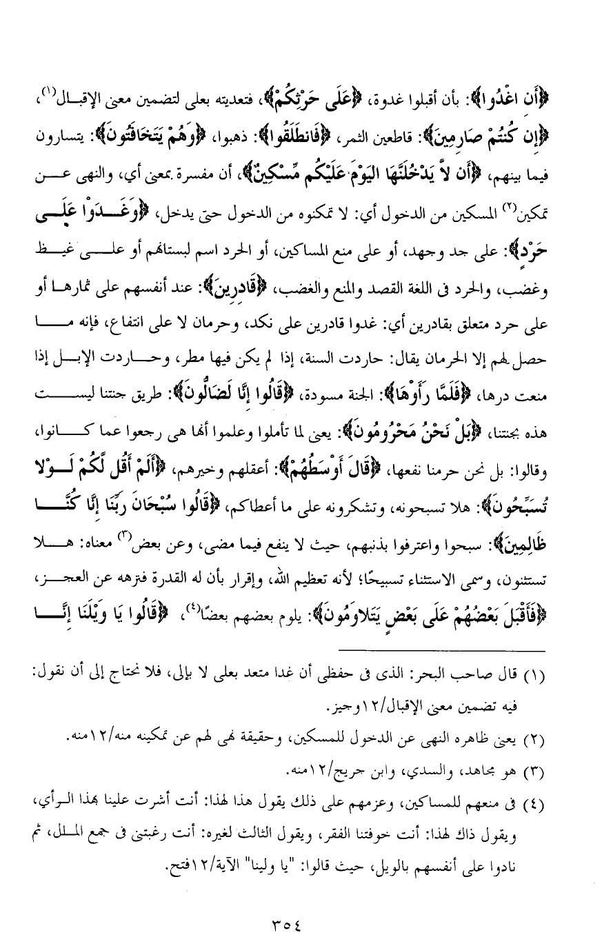(أَنِ اغْدُوا): بأن أقبلوا غدوة، (عَلَى حَرْثِكُمْ)، فتعديته بعلى لتضمين معنى الإقبال، (إِن كُنتُمْ صَارِمِينَ): قاطعين الثمر، (فَانطَلَقُوا): ذهبوا، (وَهُمْ يَتَخَافتونَ): يتسارون فيما بينهم، (أَنْ لَا يَدْخُلَنَّهَا الْيَوْمَ عَلَيْكُمْ مِسْكِينٌ)، أن مفسرة بمعنى أي، والنهي عن تمكين المسكين من الدخول أي: لا تمكنوه من الدخول حتى يدخل، (وَغَدَوْا عَلَى حَرْدٍ): على جد وجهد، أو على منع المساكين، أو الحرد اسم لبستانهم أو على غيظ وغضب، والحرد في اللغة القصد والمنع والغضب، (قَادِرِينَ): عند أنفسهم على ثمارها أو على حرد متعلق بـ قادرين أي: غدوا قادرين على نكد، وحرمان لا على انتفاع، فإنه ما حصل لهم إلا الحرمان يقال: حاردت السنة، إذا لم يكن فيها مطر، وحاردت الإبل إذا منعت درها، (فَلَمَّا رَأَوْهَا): الجنة مسودة، (قَالُوا إِنَّا لَضَالُّونَ): طريق جنتنا ليست هذه بجنتنا، (بَلْ نَحْنُ مَحْرُومُونَ): يعني لما تأملوا وعلموا أنها هي رجعوا عما كانوا، وقالوا: بل نحن حرمنا لفعها، (قَالَ أَوْسَطُهمْ): أعقلهم وخيرهم، (أَلَمْ أَقُل لَكُمْ لَوْلا تُسَبِّحُونَ): هلا تسبحونه، وتشكرونه على ما أعطاكم، (قَالُوا سُبْحَانَ رَبِّنَا إِنَّا كُنَّا ظَالِمِينَ): سبحوا واعترفوا بذنبهم، حيث لا ينفع فيما مضى، وعن بعض معناه: هلا تستثنون، وسمي الاستثناء تسبيحًا؛ لأنه تعظيم الله، وإقرار بأن له القدرة فنزهه عن العجز، (فَأَقْبَلَ بَعْضُهُمْ عَلَى بَعْص يَتَلاوَمُونَ): يلوم بعضهم بعضًا، (قَالُوا يَا وَيْلَنَا إِنَّا