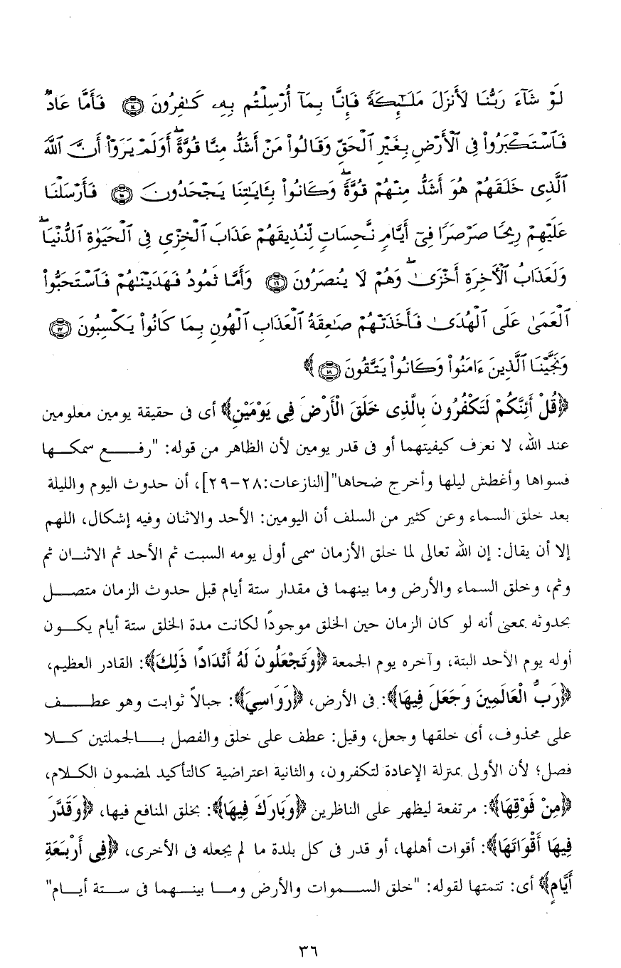 (قُلْ أَئِنَّكُمْ لَتَكْفُرُونَ بِالَّذِي خَلَقَ الْأَرْضَ فِي يَوْمَيْنِ) أي في حقيقة يومين معلومين عند الله، لا نعرف كيفيتهما أو في قدر يومين لأن الظاهر من قوله: " رفع سمكها فسواها وأغطش ليلها وأخرج ضحاها " [النازعات: 28 - 29]، أن حدوث اليوم والليلة بعد خلق السماء وعن كثير من السلف أن اليومين: الأحد والاثنان وفيه إشكال، اللهم إلا أن يقال: إن الله تعالى لما خلق الأزمان عى أول يومه السبت ثم الأحد ثم الاثنان ثم وثم، وخلق السماء والأرض وما بينهما في مقدار ستة أيام قبل حدوث الزمان متصل بحدوثه بمعنى أنه لو كان الزمان حين الخلق موجودًا لكانت مدة الخلق ستة أيام يكون أوله يوم الأحد ألبتَّة، وآخره يوم الجمعة (وَتَجْعَلُونَ لَهُ أَنْدَادًا ذَلِكَ): القادر العظيم، (رَبُّ الْعَالَمِينَ وَجَعَلَ فِيهَا): في الأرض، (رَوَاسِيَ): جبالاً ثوابت وهو عطف على محذوف، أي خلقها وجعل، وقيل: عطف على خلق والفصل بالجملتين كلا فصل؛ لأن الأولى بمنزلة الإعادة لتكفرون، والثانية اعتراضية كالتأكيد لمضمون الكلام، (مِنْ فَوْقِهَا): مرتفعة ليظهر على الناظرين (وَبَارَكَ فِيهَا): بخلق المنافع فيها، (وَقَدَّرَ فِيهَا أَقْوَاتَهَا): أقوات أهلها، أو قدر في كل بلدة ما لم يجعله في الأخرى، (فِي أَرْبَعَةِ أَيَّامٍ) أي: تتمتها لقوله: " خلق السماوات والأرض وما بينهما في ستة أيام "