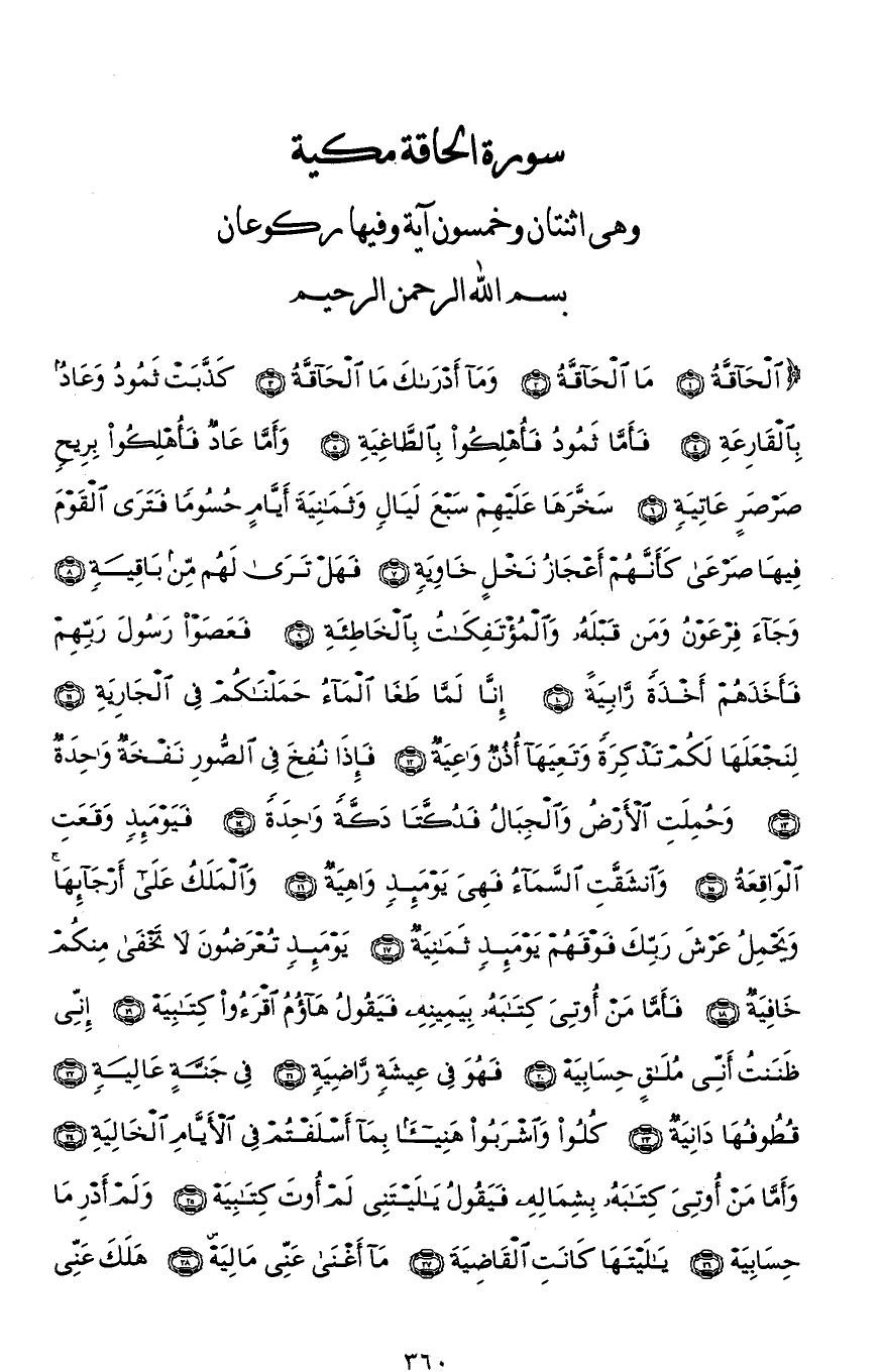(الْحَاقَّةُ (1) مَا الْحَاقَّةُ (2) وَمَا أَدْرَاكَ مَا الْحَاقَّةُ (3) كَذَّبَتْ ثَمُودُ وَعَادٌ بِالْقَارِعَةِ (4) فَأَمَّا ثَمُودُ فَأُهْلِكُوا بِالطَّاغِيَةِ (5) وَأَمَّا عَادٌ فَأُهْلِكُوا بِرِيحٍ صَرْصَرٍ عَاتِيَةٍ (6) سَخَّرَهَا عَلَيْهِمْ سَبْعَ لَيَالٍ وَثَمَانِيَةَ أَيَّامٍ حُسُومًا فَتَرَى الْقَوْمَ فِيهَا صَرْعَى كَأَنَّهُمْ أَعْجَازُ نَخْلٍ خَاوِيَةٍ (7) فَهَلْ تَرَى لَهُمْ مِنْ بَاقِيَةٍ (8) وَجَاءَ فِرْعَوْنُ وَمَنْ قَبْلَهُ وَالْمُؤْتَفِكَاتُ بِالْخَاطِئَةِ (9) فَعَصَوْا رَسُولَ رَبِّهِمْ فَأَخَذَهُمْ أَخْذَةً رَابِيَةً (10) إِنَّا لَمَّا طَغَى الْمَاءُ حَمَلْنَاكُمْ فِي الْجَارِيَةِ (11) لِنَجْعَلَهَا لَكُمْ تَذْكِرَةً وَتَعِيَهَا أُذُنٌ وَاعِيَةٌ (12) فَإِذَا نُفِخَ فِي الصُّورِ نَفْخَةٌ وَاحِدَةٌ (13) وَحُمِلَتِ الْأَرْضُ وَالْجِبَالُ فَدُكَّتَا دَكَّةً وَاحِدَةً (14) فَيَوْمَئِذٍ وَقَعَتِ الْوَاقِعَةُ (15) وَانْشَقَّتِ السَّمَاءُ فَهِيَ يَوْمَئِذٍ وَاهِيَةٌ (16) وَالْمَلَكُ عَلَى أَرْجَائِهَا وَيَحْمِلُ عَرْشَ رَبِّكَ فَوْقَهُمْ يَوْمَئِذٍ ثَمَانِيَةٌ (17) يَوْمَئِذٍ تُعْرَضُونَ لَا تَخْفَى مِنْكُمْ خَافِيَةٌ (18) فَأَمَّا مَنْ أُوتِيَ كِتَابَهُ بِيَمِينِهِ فَيَقُولُ هَاؤُمُ اقْرَءُوا كِتَابِيَهْ (19) إِنِّي ظَنَنْتُ أَنِّي مُلَاقٍ حِسَابِيَهْ (20) فَهُوَ فِي عِيشَةٍ رَاضِيَةٍ (21) فِي جَنَّةٍ عَالِيَةٍ (22) قُطُوفُهَا دَانِيَةٌ (23) كُلُوا وَاشْرَبُوا هَنِيئًا بِمَا أَسْلَفْتُمْ فِي الْأَيَّامِ الْخَالِيَةِ (24) وَأَمَّا مَنْ أُوتِيَ كِتَابَهُ بِشِمَالِهِ فَيَقُولُ يَا لَيْتَنِي لَمْ أُوتَ كِتَابِيَهْ (25) وَلَمْ أَدْرِ مَا حِسَابِيَهْ (26) يَا لَيْتَهَا كَانَتِ الْقَاضِيَةَ (27) مَا أَغْنَى عَنِّي مَالِيَهْ (28) هَلَكَ عَنِّي