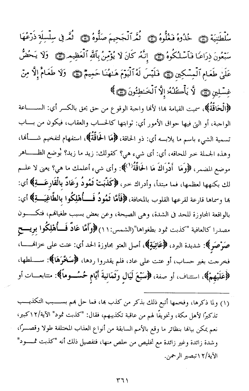 (الْحَاقَّةُ)، سميت القيامة بها؛ لأنها واجبة الوقوع من حق يحق بالكسر أي: الساعة الواجبة، أو التي فيها حواق الأمور أي: ثوابتها كالحساب والعقاب، فيكون من باب تسمية الشيء باسم ما يلابسه أي: ذو الحاقة، (مَا الحَاقَّةُ)، استفهام لتفخيم شأنها، وهذه الجملة خبر للحاقة، أي: أي شيء هي؟ كقولك: زيد ما زيد؟ بوضع الظاهر موضع المضمر، (وَمَا أَدْرَاكَ مَا الحَاقَّةُ): وأى شيء أعلمك ما هي؟ يعني لا علم لك بكنهها لعظمها، فما مبتدأ، وأدراك خبر، (كَذَّبَتْ ثَمُودُ وَعَادٌ بِالْقَارِعَةِ) أي: بها وسماها قارعة لقرعها القلوب بالمخافة، (فَأَمَّا ثَمُودُ فَأُهْلِكُوا بِالطَّاغِيَةِ) أي: بالواقعة المجاوزة للحد في الشدة، وهي الصيحة، وعن بعض بسبب طغيانهم، فتكون مصدرا كالعافية " كذبت ثمود بطغواها " [الشمس: 11] (وَأَمَّا عَادٌ فَأُهْلِكُوا بِرِيحٍ صَرْصَرٍ): شديدة البرد، (عَاتِيَةٍ)، أصل العتو مجاوزة الحد أي: عتت على خزانها، فخرجت بغير حساب، أو عتت على عاد، فلم يقدروا ردها، (سَخَّرَهَا): سلطها، (عَلَيْهِمْ)، استئناف، أو صفة، (سَبْعَ لَيَالٍ وَثَمَانِيَةَ أَيَّامٍ حُسُومًا): متتابعات أو