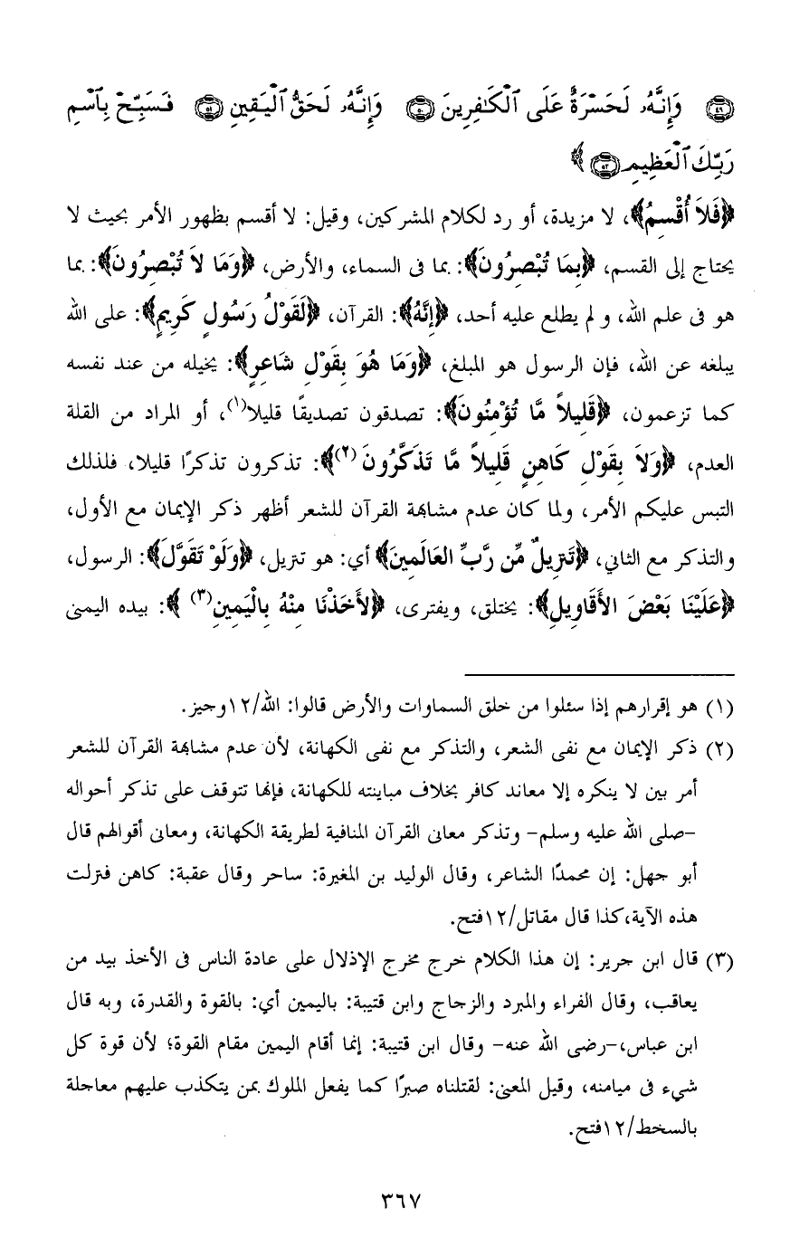 (فَلَا أُقْسِمُ)، لا مزيدة، أو رد لكلام المشركين، وقيل: لا أقسم بظهور الأمر بحيث لا يحتاج إلى القسم، (بِمَا تُبْصِرُونَ): بما في السماء، والأرض، (وَمَا لَا تُبْصِرُونَ): بما هو في علم الله، ولم يطلع عليه أحد، (إِنَّهُ): القرآن، (لَقَوْلُ رَسُولٍ كَرِيمٍ): على الله يبلغه عن الله، فإن الرسول هو المبلغ، (وَمَا هُوَ بِقَوْلِ شَاعِرٍ): يخيله من عند نفسه كما تزعمون، (قَلِيلًا مَا تُؤْمِنُونَ): تصدقون تصديقًا قليلاً، أو المراد من القلة العدم، (وَلَا بِقَوْلِ كَاهِنٍ قَلِيلًا مَا تَذَكَّرُونَ): تذكرون تذكرًا قليلاً، فلذلك التبس عليكم الأمر، ولما كان عدم مشابهة القرآن للشعر أظهر ذكر الإيمان مع الأول، والتذكر مع الثاني، (تَنْزِيلٌ مِنْ رَبِّ الْعَالَمِينَ) أي: هو تنزيل، (وَلَوْ تَقَوَّلَ): الرسول، (عَلَيْنَا بَعْضَ الأَقَاوِيلِ): يختلق، ويفتري، (لأَخَذْنَا مِنْهُ بِالْيَمِينِ): بيده اليمنى