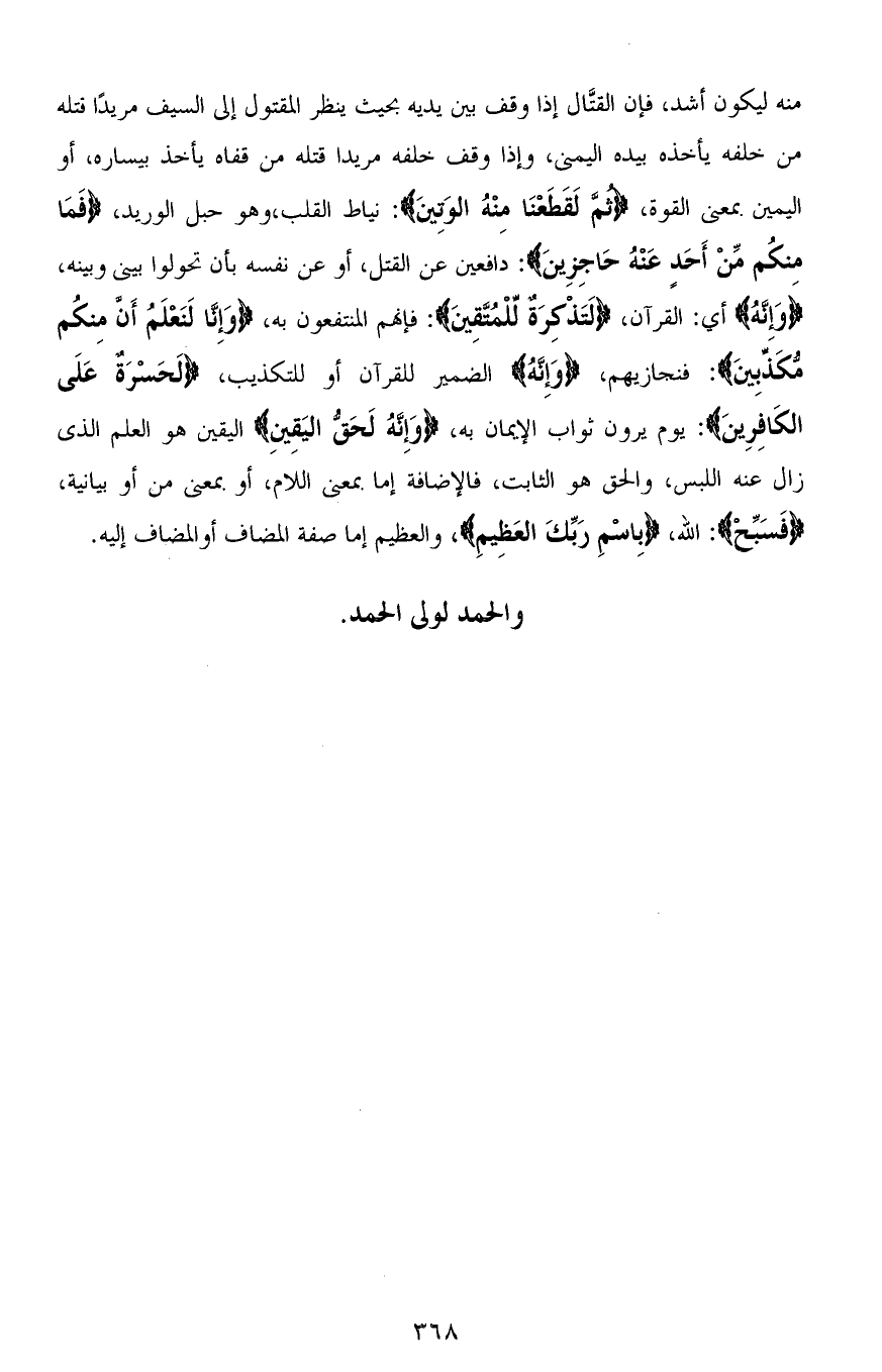 منه ليكون أشد، فإن القتَّال إذا وقف بين يديه بحيث ينظر المقتول إلى السيف مريدًا قتله من خلفه يأخذه بيده اليمني، وإذا وقف خلفه مريدًا قتله من قفاه يأخذ بيساره، أو اليمين بمعنى القوة، (ثُمَّ لَقَطَعْنَا مِنْهُ الْوَتِينَ): نياط القلب، وهو حبل الوريد، (فَمَا مِنْكُمْ مِنْ أَحَدٍ عَنْهُ حَاجِزِينَ): دَافعين عن القتل، أو عن نفسه بأن تحولوا بيني وبينه، (وَإِنَّهُ) أي: القرآن، (لَتَذْكِرَةٌ للْمُتَّقِينَ): فإنهم المنتفعون به، (وَإِنَّا لَنَعْلَمُ أَنَّ مِنْكُمْ مُكَذِّبِينَ): فنجازيهم، (وَإِنَّهُ) الضمير للقرآن أو للتكذيب، (لَحَسْرَةٌ عَلَى الْكَافِرِينَ): يوم يرون ثواب الإيمان به، (وَإِنَّهُ لَحَقُّ الْيَقِينِ) اليقين هو العلم الذي زال عنه اللبس، والحق هو الثابت، فالإضافة إما بمعنى اللام، أو بمعنى من أو بيانية، (فَسَبِّحْ): الله، (بِاسْمِ رَبِّكَ الْعَظِيمِ)، والعظيم إما صفة المضاف أو المضاف إليه.