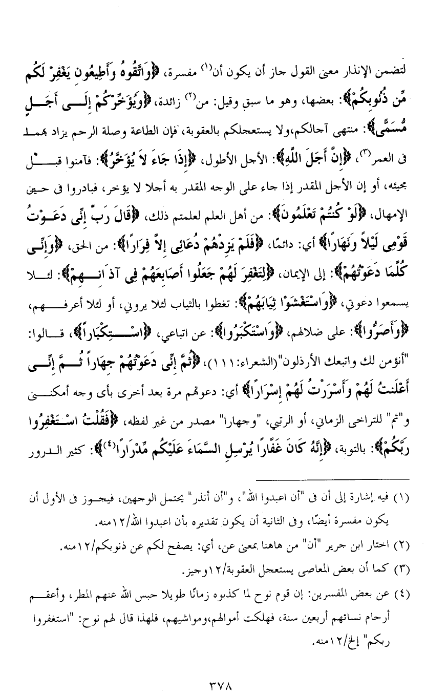 لتضمن الإنذار معنى القول جاز أن يكون أن مفسرة، (وَاتَّقُوهُ وَأَطِيعُونِ يَغْفِرْ لَكُمْ مِنْ ذُنُوبِكُمْ): بعضها، وهو ما سبق وقيل: من زائدة، (وَيُؤَخِّرْكُمْ إِلَى أَجَلٍ مُّسَمًّى): منتهى آجالكم، ولا يستعجلكم بالعقوبة، فإن الطاعة وصلة الرحم يزاد بهما في العمر، (إِنَّ أَجَلَ اللهِ): الأجل الأطول، (إِذَا جَاءَ لَا يُؤَخَّرُ): فآمِنوا قبْل مجيئه، أو إن الأجل المقدر إذا جاء على الوجه المقدر به أجلاً لا يؤخر، فبادروا في حين الإمهال، (لَوْ كُنتُمْ تَعْلَمُونَ): من أهل العلم لعلمتم ذلك، (قَالَ رَبِّ إِنِّي دَعَوْتُ قَوْمِي لَيْلًا وَنَهَارًا) أي: دائمًا، (فَلَمْ يَزِدْهُمْ دُعَائِي إِلَّا فِرَارًا): من الحق، (وَإِنِّي كُلَّمَا دَعَوْتُهُمْ): إلى الإيمان، (لِتَغْفِرَ لَهُمْ جَعَلُوا أَصَابِعَهُمْ فِي آذَانِهِمْ): لئلا يسمعوا دعوتي، (وَاسْتَغْشَوْا ثِيَابَهُمْ): تغطوا بالثياب لئلا يروني، أو لئلا أعرفهم، (وَأَصَرُّوا): على ضلالهم، (وَاسْتَكْبَرُوا): عن اتباعي، (اسْتِكْبَارًا)، قالوا: (أنؤمن لك واتبعك الأرذلون) [الشعراء: 111]، (ثُمَّ إِنِّي دَعَوْتُهُمْ جِهَارًا ثُمَّ إِنِّي أَعْلَنْتُ لَهُمْ وَأَسْرَرْتُ لَهُمْ إِسْرَارًا) أي: دعوتهم مرة بعد أخرى بأي وجه أمكنني و " ثم " للتراخي الزماني، أو الرتبي، " وجهارًا " مصدر من غير لفظه، (فَقُلْتُ اسْتَغْفِرُوا رَبَّكُمْ): بالتوبة، (إِنَّهُ كَانَ غَفَّارًا يُرْسِلِ السَّمَاءَ عَلَيْكُم مِّدْرَارًا): كثير الدرور