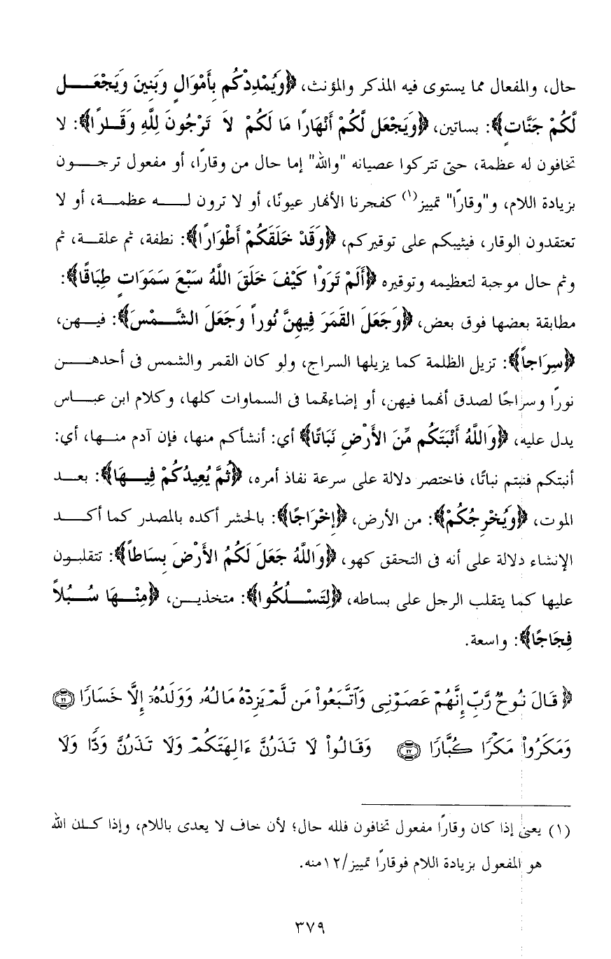 حال، والمفعال مما يستوي فيه المذكر والمؤنث، (وَيُمْدِدْكُمْ بِأَمْوَالٍ وَبَنِينَ وَيَجْعَلْ لَكُمْ جَنَّاتٍ): بساتين، (وَيَجْعَلْ لَكُمْ أَنْهَارًا مَا لَكُمْ لَا تَرْجُونَ لله وَقَارًا): لا تخافون له عظمة، حتى تتركوا عصيانه " والله " إما حال من وقارًا، أو مفعول ترجون بزيادة اللام، و " وقارًا " تمييز كـ فجرنا الأنهار عيونًا، أو لا ترون له عظمة، أو لا تعتقدون الوقار، فيثيبكم على توقيركم، (وَقَدْ خَلَقَكُمْ أَطْوَارًا): نطفة، ثم علقة، ثم وثم حال موجبة لتعظيمه وتوقيره (أَلَمْ تَرَوْا كَيْفَ خَلَقَ اللهُ سَبْعَ سَمَاوَاتٍ طِبَاقًا): مطابقة بعضها فوق بعض، (وَجَعَلَ الْقَمَرَ فِيهِنَّ نُورًا وَجَعَلَ الشَّمْسَ): فيهن، (سِرَاجًا): تزيل الظلمة كما يزيلها السراج، ولو كان القمر والشمس في أحدهن نورًا وسراجًا لصدق أنهما فيهن، أو إضاءتهما في السماوات كلها، وكلام ابن عباس يدل عليه، (وَاللهُ أَنْبَتَكُم مِّنَ الأَرْضِ نَبَاتًا) أي: أنشأكم منها، فإن آدم منها، أي: أنبتكم فنبتم نباتًا، فاختصر دلالة على سرعة نفاذ أمره، (ثُمَّ يُعِيدُكُمْ فِيهَا): بعد الموت، (وَيُخْرِجُكمْ): من الأرض، (إِخْرَاجًا): بالحشر أكده بالمصدر كما أكد الإنشاء دلالة على أنه في التحقق كهو، (وَالله جَعَلَ لَكُم الأَرْضَ بسَاطًا): تتقلبون عليها كما يتقلب الرجل على بساطه، (لِتَسْلكوا): متخذين، (مِنْهَا سُبُلًا فِجَاجًا): واسعة.