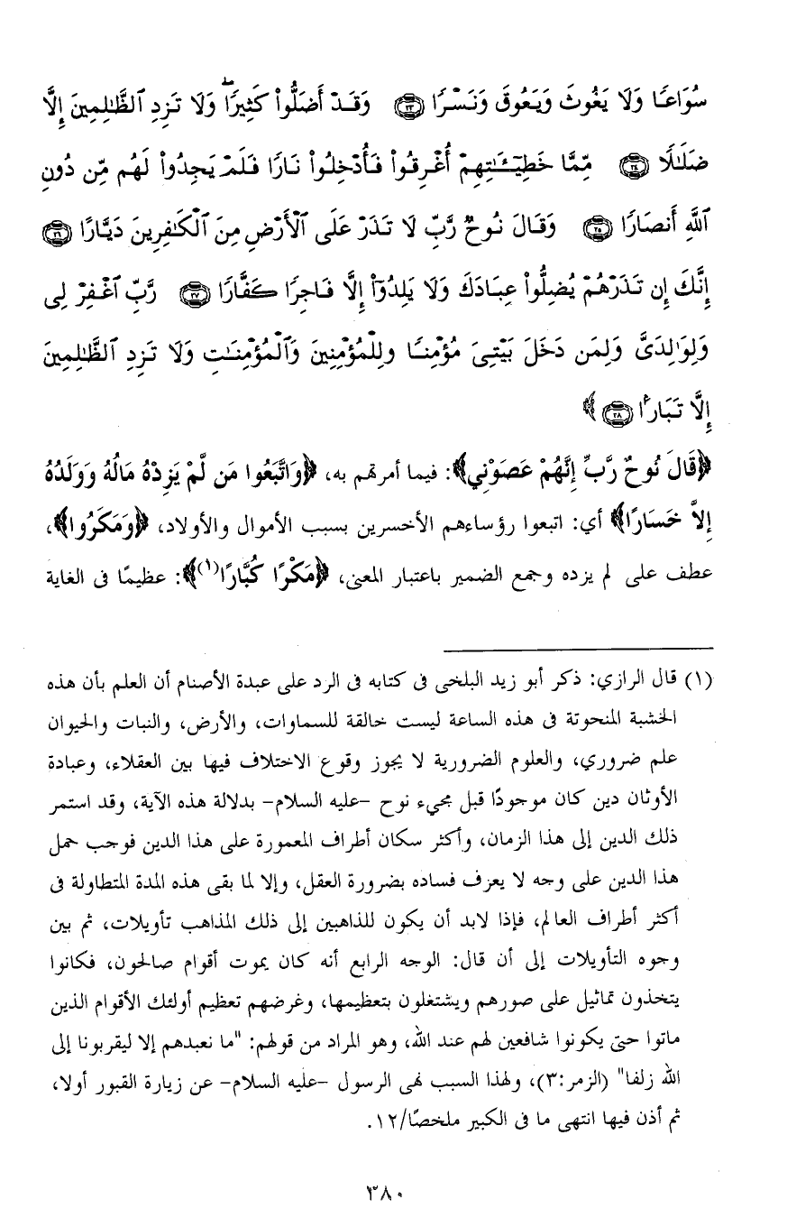 وَلَا سُوَاعًا وَلَا يَغُوثَ وَيَعُوقَ وَنَسْرًا (23) وَقَدْ أَضَلُّوا كَثِيرًا وَلَا تَزِدِ الظَّالِمِينَ إِلَّا ضَلَالًا (24) مِمَّا خَطِيئَاتِهِمْ أُغْرِقُوا فَأُدْخِلُوا نَارًا فَلَمْ يَجِدُوا لَهُمْ مِنْ دُونِ اللهِ أَنْصَارًا (25) وَقَالَ نُوحٌ رَبِّ لَا تَذَرْ عَلَى الْأَرْضِ مِنَ الْكَافِرِينَ دَيَّارًا (26) إِنَّكَ إِنْ تَذَرْهُمْ يُضِلُّوا عِبَادَكَ وَلَا يَلِدُوا إِلَّا فَاجِرًا كَفَّارًا (27) رَبِّ اغْفِرْ لِي وَلِوَالِدَيَّ وَلِمَنْ دَخَلَ بَيْتِيَ مُؤْمِنًا وَلِلْمُؤْمِنِينَ وَالْمُؤْمِنَاتِ وَلَا تَزِدِ الظَّالِمِينَ إِلَّا تَبَارًا (28)