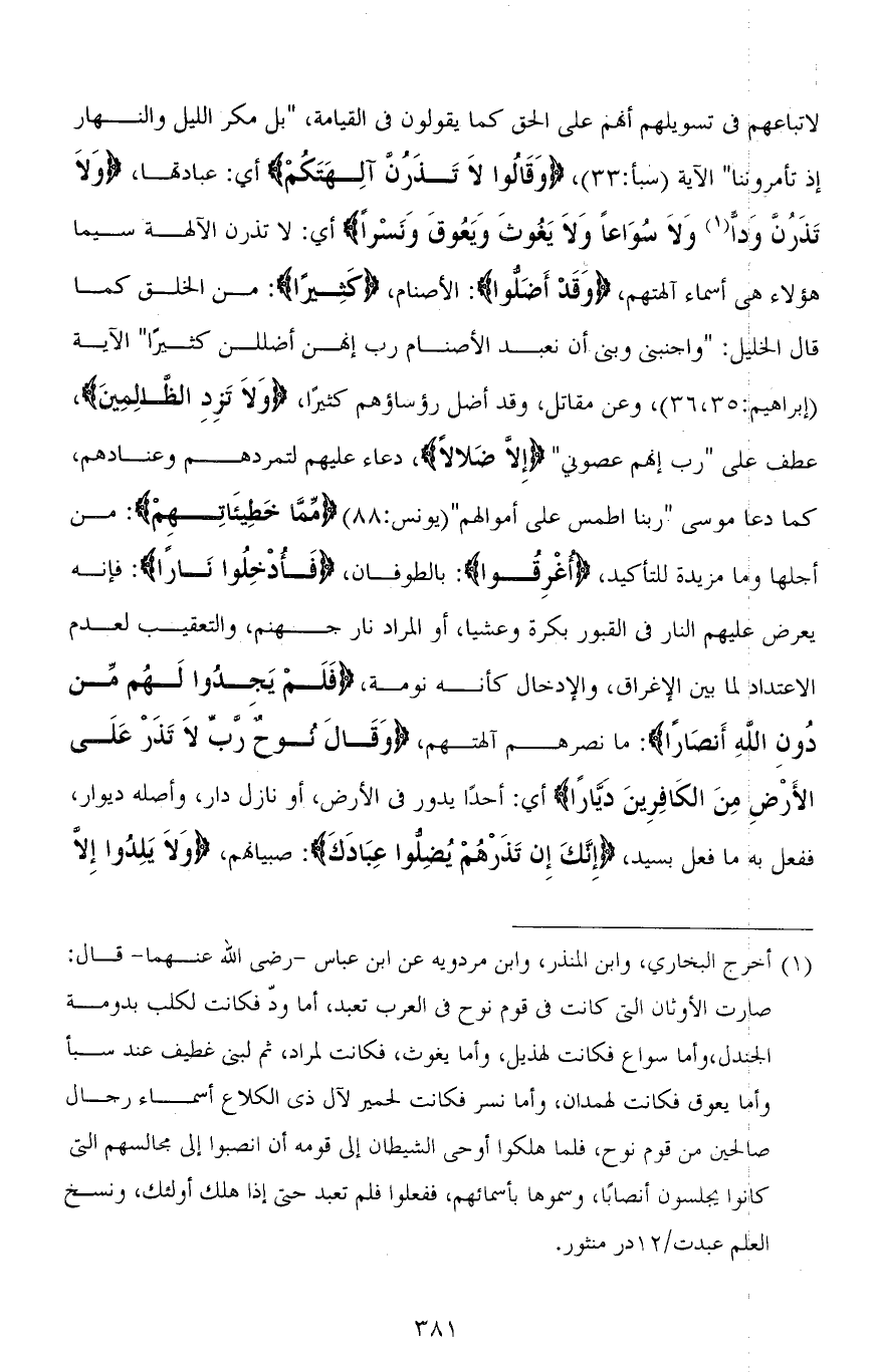 لاتباعهم في تسويلهم أنهم على الحق كما يقولون في القيامة، (بَلْ مَكْرُ اللَّيْلِ وَالنَّهَارِ إِذْ تَأْمُرُونَنَا) الآية [سبأ: 33]، (وَقَالُوا لَا تَذَرُنَّ آلِهَتَكُمْ) أي: عبادتها، (وَلَا تَذَرُنَّ وَدًّا وَلَا سُوَاعًا وَلَا يَغُوثَ وَيَعُوقَ وَنَسْرًا) أي: لا تذرن الآلهة سيما هؤلاء هي أسماء آلهتهم، (وَقَدْ أَضَلُّوا): الأصنام، (كَثِيرًا): من الخلق كما قال الخليل: (وَاجْنُبْنِي وَبَنِيَّ أَنْ نَعْبُدَ الْأَصْنَامَ رَبِّ إِنَّهُنَّ أَضْلَلْنَ كَثِيرًا) الآية [إبراهيم: 35، 36]، وعن مقاتل، وقد أضل رؤساؤهم كثيرًا، (وَلَا تَزِدِ الظَّالِمِينَ)، عطف على " ربِّ إنهم عصوني " (إِلَّا ضَلَالًا)، دعاء عليهم لتمردهم وعنادهم، كما دعا موسى (رَبَّنَا اطْمِسْ عَلَى أَمْوَالِهِمْ) [يونس: 88] (مِمَّا خَطِيئَاتِهِمْ): من أجلها وما مزيدة للتأكيد، (أُغْرِقُوا): بالطوفان، (فَأُدْخِلُوا نَارًا): فإنه يعرض عليهم النار في القبور بكرة وعشيا، أو المراد نار جهنم، والتعقيب لعدم الاعتداد لما بين الإغراق، والإدخال كأنه نومة، (فَلَمْ يَجِدُوا لَهُمْ مِنْ دُونِ اللهِ أَنْصَارًا): ما نصرهم آلهتهم، (وَقَالَ نُوحٌ رَبِّ لَا تَذَرْ عَلَى الْأَرْضِ مِنَ الْكَافِرِينَ دَيَّارًا) أي: أحدًا يدور في الأرض، أو نازل دار، وأصله ديوار، ففعل به ما فعل بسيد، (إِنَّكَ إِنْ تَذَرْهُمْ يُضِلُّوا عِبَادَكَ): صبيانهم، (وَلَا يَلِدُوا إِلَّا