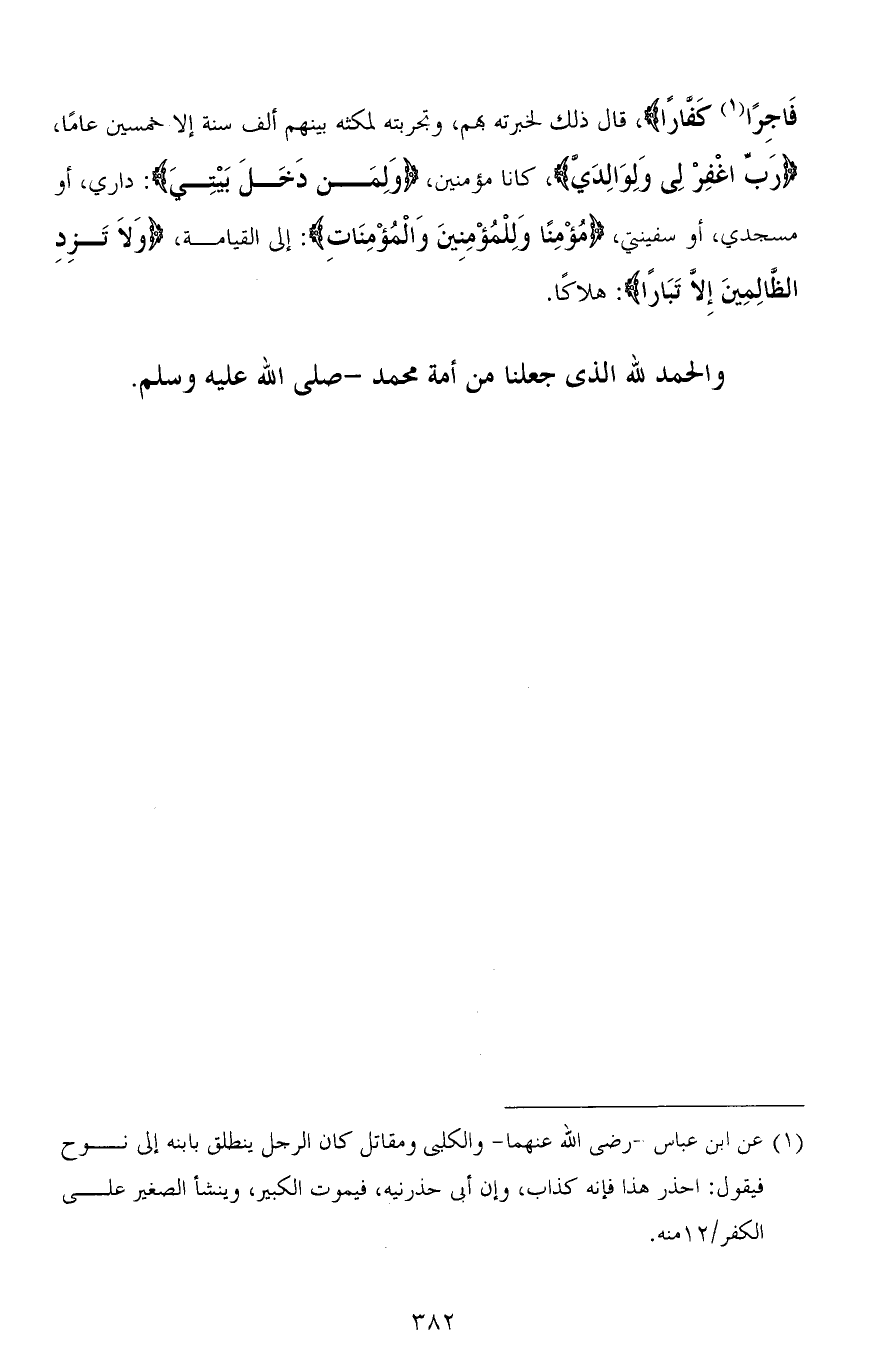 فَاجِرًا كَفَّارًا)، قال ذلك لخبرته بهم، وتجربته لمكثه بينهم ألف سنة إلا خمسين عامًا، (رَبِّ اغْفِرْ لِي وَلِوَالِدَيَّ)، كانا مؤمنين، (وَلِمَنْ دَخَلَ بَيْتِيَ): داري، أو مسجدي، أو سفينتي، (مُؤْمِنًا وَلِلْمُؤْمِنِينَ وَالْمُؤْمِنَاتِ): إلى القيامة، (وَلَا تَزِدِ الظَّالِمِينَ إِلَّا تَبَارًا): هلاكًا.