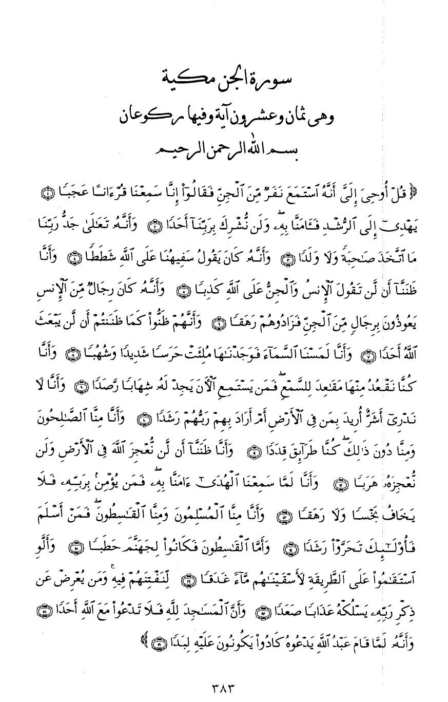 (قُلْ أُوحِيَ إِلَيَّ أَنَّهُ اسْتَمَعَ نَفَرٌ مِنَ الْجِنِّ فَقَالُوا إِنَّا سَمِعْنَا قُرْآنًا عَجَبًا (1) يَهْدِي إِلَى الرُّشْدِ فَآمَنَّا بِهِ وَلَنْ نُشْرِكَ بِرَبِّنَا أَحَدًا (2) وَأَنَّهُ تَعَالَى جَدُّ رَبِّنَا مَا اتَّخَذَ صَاحِبَةً وَلَا وَلَدًا (3) وَأَنَّهُ كَانَ يَقُولُ سَفِيهُنَا عَلَى اللهِ شَطَطًا (4) وَأَنَّا ظَنَنَّا أَنْ لَنْ تَقُولَ الْإِنْسُ وَالْجِنُّ عَلَى اللهِ كَذِبًا (5) وَأَنَّهُ كَانَ رِجَالٌ مِنَ الْإِنْسِ يَعُوذُونَ بِرِجَالٍ مِنَ الْجِنِّ فَزَادُوهُمْ رَهَقًا (6) وَأَنَّهُمْ ظَنُّوا كَمَا ظَنَنْتُمْ أَنْ لَنْ يَبْعَثَ اللهُ أَحَدًا (7) وَأَنَّا لَمَسْنَا السَّمَاءَ فَوَجَدْنَاهَا مُلِئَتْ حَرَسًا شَدِيدًا وَشُهُبًا (8) وَأَنَّا كُنَّا نَقْعُدُ مِنْهَا مَقَاعِدَ لِلسَّمْعِ فَمَنْ يَسْتَمِعِ الْآنَ يَجِدْ لَهُ شِهَابًا رَصَدًا (9) وَأَنَّا لَا نَدْرِي أَشَرٌّ أُرِيدَ بِمَنْ فِي الْأَرْضِ أَمْ أَرَادَ بِهِمْ رَبُّهُمْ رَشَدًا (10) وَأَنَّا مِنَّا الصَّالِحُونَ وَمِنَّا دُونَ ذَلِكَ كُنَّا طَرَائِقَ قِدَدًا (11) وَأَنَّا ظَنَنَّا أَنْ لَنْ نُعْجِزَ اللهَ فِي الْأَرْضِ وَلَنْ نُعْجِزَهُ هَرَبًا (12) وَأَنَّا لَمَّا سَمِعْنَا الْهُدَى آمَنَّا بِهِ فَمَنْ يُؤْمِنْ بِرَبِّهِ فَلَا يَخَافُ بَخْسًا وَلَا رَهَقًا (13) وَأَنَّا مِنَّا الْمُسْلِمُونَ وَمِنَّا الْقَاسِطُونَ فَمَنْ أَسْلَمَ فَأُولَئِكَ تَحَرَّوْا رَشَدًا (14) وَأَمَّا الْقَاسِطُونَ فَكَانُوا لِجَهَنَّمَ حَطَبًا (15) وَأَلَّوِ اسْتَقَامُوا عَلَى الطَّرِيقَةِ لَأَسْقَيْنَاهُمْ مَاءً غَدَقًا (16) لِنَفْتِنَهُمْ فِيهِ وَمَنْ يُعْرِضْ عَنْ ذِكْرِ رَبِّهِ يَسْلُكْهُ عَذَابًا صَعَدًا (17) وَأَنَّ الْمَسَاجِدَ لله فَلَا تَدْعُوا مَعَ اللهِ أَحَدًا (18) وَأَنَّهُ لَمَّا قَامَ عَبْدُ اللهِ يَدْعُوهُ كَادُوا يَكُونُونَ عَلَيْهِ لِبَدًا (19)