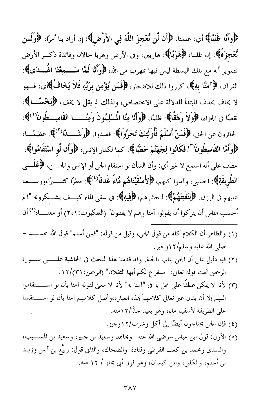 (وَأَنَّا ظَنَنَّا) أي: علمنا، (أَنْ لَنْ نُعْجِزَ اللهَ فِي الْأَرْضِ): إن أراد بنا أمرًا، (وَلَنْ نُعْجِزَهُ): إن طلبنا، (هَرَبًا): هاربين، وفي الأرض وهربا حالان وفائدة ذكر الأرض تصوير أنه مع تلك البسطة ليي فيها بمهرب من الله، (وَأَنَّا لَمَّا سَمِعْنَا الْهُدَى): القرآن، (آمَنَّا بِهِ)، كرروا ذلك للافتحار، (فَمَنْ يُؤْمِنْ بِرَبِّهِ فَلَا يَخَافُ) أي: فهو لا يخاف بحذف المبتدأ للدلالة على الاختصاص، ولذلك لم يقل لا يخف، (بَخْسًا): نقصًا في الجزاء، (وَلاَ رَهَقًا): ظلمًا، (وَأَنَّا مِنَّا الْمُسْلِمُونَ وَمِنَّا الْقَاسِطُونَ): الحائرون عن الحق، (فمَنْ أَسْلَمَ فَأُولئِكَ تَحَرَّوْا): قصدوا، (رَشَدًا): عظيمًا، (وَأَمَّا الْقَاسِطُونَ فَكَانُوا لِجَهَنَّمَ حَطَبًا): كما لكفار الإنس، (وَأَلَّوِ اسْتَقَامُوا)، عطف على أنه استمع لا غير أي: وأن الشأن لو استقام الجن أو الإنس والجن، (عَلَى الطَّرِيقَةِ): الحسنى، وآمنوا كلهم، (لَأَسْقَيْنَاهُمْ مَاءً غَدَقًا): مطرًا كثيرًا، ووسعنا عليهم في الرزق، (لِنَفْتِنَهُمْ): لنحشرهم، (فيهِ): في سقي الماء كيف يشكرونه (الم أَحَسِبَ النَّاسُ أَنْ يُتْرَكُوا أَنْ يَقُولُوا آمَنَّا وَهُمْ لَا يُفْتَنُونَ) [العنكبوت: 1، 2] أو معناه أن