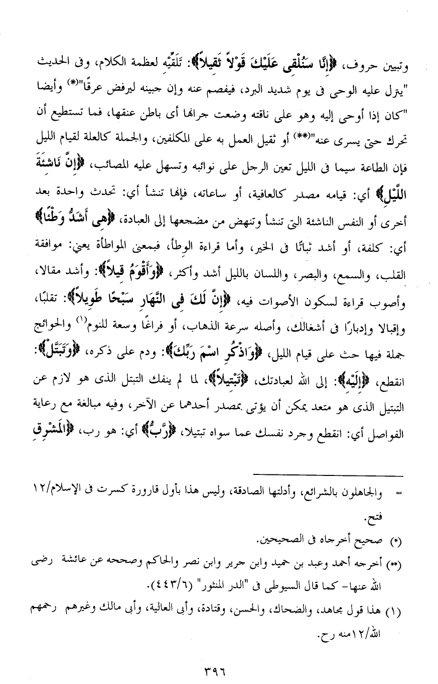 وتبيين حروف، (إِنَّا سَنُلْقِي عَلَيْكَ قَوْلًا ثَقِيلًا): تَلَقِّيْهِ لعظمة الكلام، وفي الحديث " ينزل عليه الوحي في يوم شديد البرد، فيفصم عنه وإن جبينه ليرفض عرقًا " وأيضًا " كان إذا أوحى إليه وهو على ناقته وضعت جرانها أي باطن عنقها، فما تستطيع أن تحرك حتى يسرى عنه " أو ثقيل العمل به على المكلفين، والجملة كالعلة لقيام الليل فإن الطاعة سيما في الليل تعين الرجل على نوائبه وتسهل عليه المصائب، (إِنَّ نَاشِئَةَ اللَّيْلِ) أي: قيامه مصدر كالعافية، أو ساعاته، فإنها تنشأ أي: تحدث واحدة بعد أخرى أو النفس الناشئة التي تنشأ وتنهض من مضجعها إلى العبادة، (هِيَ أَشَدُّ وَطْئًا) أي: كلفة، أو أشد ثباتًا في الخير، وأما قراءة [الوِطاء]، فبمعنى المواطأة يعني: موافقة القلب، والسمع، والبصر، واللسان بالليل أشد وأكثر، (وَأَقْوَمُ قِيلًا): وأشد مقالاً، وأصوب قراءة لسكون الأصوات فيه، (إِنَّ لَكَ فِي النَّهَارِ سَبْحًا طَوِيلًا): تقلبًا، وإقبالاً وإدبارًا في أشغالك، وأصله سرعة الذهاب، أو فراغًا وسعة للنوم والحوائج جملة فيها حث على قيام الليل، (وَاذْكُرِ اسْمَ رَبِّكَ): ودم على ذكره، (وَتَبَتَّلْ): انقطع، (إِلَيْهِ): إلى الله لعبادتك، (تَبْتِيلًا)، لما لم ينفك التبتل الذي هو لازم عن التبتيل الذي هو متعد يمكن أن يؤتى بمصدر أحدهما عن الآخر، وفيه مبالغة مع رعاية الفواصل أي: انقطع وجرد نفسك عما سواه تبتيلاً، (رَبُّ) أي: هو رَبُّ، (الْمَشْرِقِ