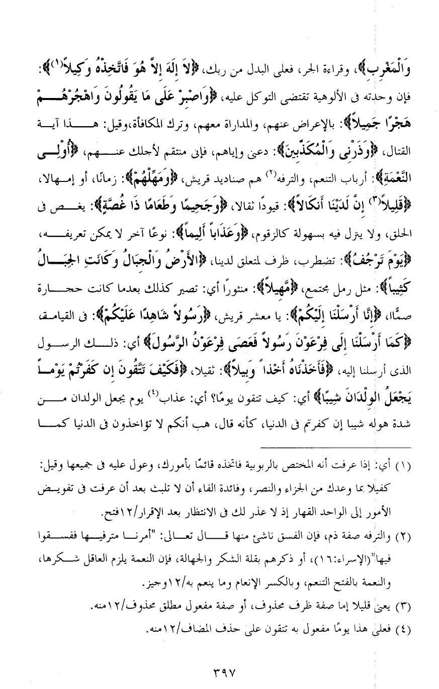 وَالْمَغرِبِ)، وقراءة الجر، فعلى البدل من ربك، (لَا إِلَهَ إِلَّا هُوَ فَاتَّخِذْهُ وَكِيلًا): فإن وحدته في الألوهية تقتضي التوكل عليه، (وَاصْبِرْ عَلَى مَا يَقُولُونَ وَاهْجُرْهُم هَجْرًا جَمِيلاً): بالإعراض عنهم، والمداراة معهم، وترك المكافأة، وقيل: هذا آية القتال، (وَذَرْنِي وَالْمُكَذِّبِينَ): دعني وإياهم، فإني منتقم لأجلك منهم، (أُولِي النَّعْمَةِ): أرباب التنعم، والترفه هم صناديد قريش، (وَمَهِّلْهُمْ): زمانًا، أو إمهالاً، (قَلِيلًا إِنَّ لَدَيْنَا أَنكَالاً): قيودًا ثقالاً، (وَجَحِيمًا وَطَعَامًا ذَا غُصَّةٍ): يغص في الحلق، ولا ينزل فيه بسهولة كالزقوم، (وَعَذَابًا أَلِيمًا): نوعًا آخر لا يمكن تعريفه، (يَوْمَ تَرْجُفُ): تضطرب، ظرف لمتعلق لدينا، (الْأَرْضُ وَالْجِبَالُ وَكَانَتِ الْجِبَالُ كَثِيبًا): مثل رمل مجتمع، (مَهِيلًا): منثورًا أي: تصير كذلك بعدما كانت حجارة صمًّا، (إِنَّا أَرْسَلْنا إِلَيْكُمْ): يا معشر قريش، (رَسُولاً شَاهِدًا عَلَيْكُمْ): في القيامة (كَمَا أَرْسَلْنَا إِلَى فِرْعَوْنَ رَسُولًا فَعَصَى فِرْعَوْنُ الرَّسُولَ) أي: ذلك الرسول الذي أرسلنا إليه، (فَأَخَذْنَاهُ أَخْذاً وَبِيلاً): ثقيلاً، (فَكَيْفَ تَتَّقُونَ إِنْ كَفَرْتُمْ يَوْمًا يَجْعَلُ الْوِلْدَانَ شِيبًا) أي: كيف تتقون يومًا؟ أي: عذاب يوم يجعل الولدان من شدة هوله شيبًا إن كفرتم في الدنيا، كأنه قال، هب أنكم لا تؤاخذون في الدنيا كما