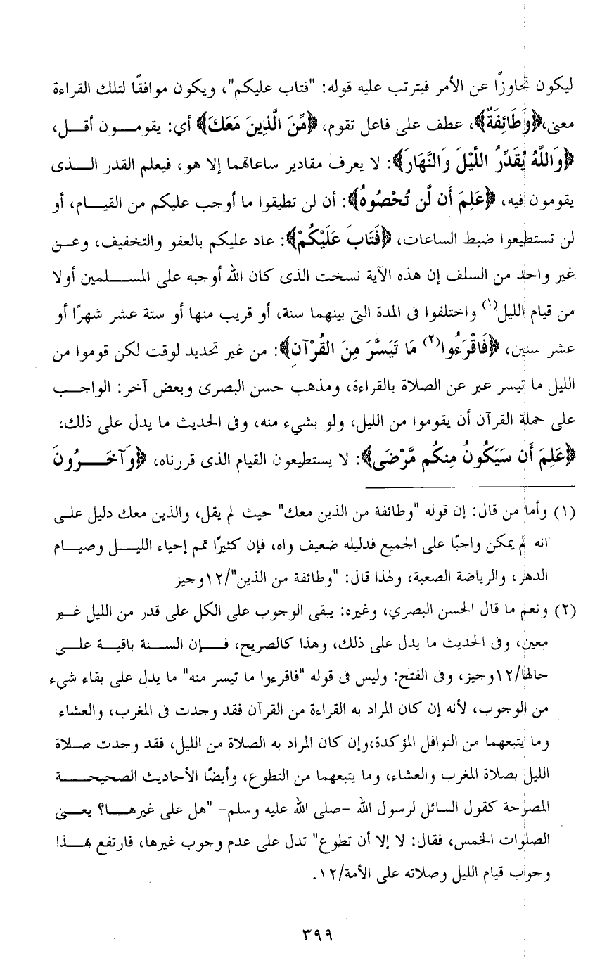 ليكون تجاوزًا عن الأمر فيترتب عليه قوله: " فتاب عليكم "، ويكون موافقًا لتلك القراءة معنى، (وَطَائِفَةٌ)، عطف على فاعل تقوم، (مِّنَ الَّذِينَ مَعَكَ) أي: يقومون أقل، (وَاللهُ يُقَدِّرُ اللَّيْلَ وَالنَّهَارَ): لا يعرف مقادير ساعاتهما إلا هو، فيعلم القدر الذي يقومون فيه، (عَلِمَ أَنْ لَنْ تُحْصُوهُ): أن لن تطيقوا ما أوجب عليكم من القيام، أو لن تستطيعوا ضبط الساعات، (فَتَابَ عَلَيْكُمْ): عاد عليكم بالعفو والتخفيف، وعن غير واحد من السلف إن هذه الآية نسخت الذي كان الله أوجبه على المسلمين أولاً من قيام الليل واختلفوا في المدة التي بينهما سنة، أو قريب منها أو ستة عشر شهرًا أو عشر سنين، (فَاقْرَءُوا مَا تَيَسَّرَ مِنَ الْقُرْآنِ): من غير تحديد لوقت لكن قوموا من الليل ما تيسر عبر عن الصلاة بالقراءة، ومذهب حسن البصري وبعض آخر: الواجب على حملة القرآن أن يقوموا من الليل، ولو بشيء منه، وفي الحديث ما يدل على ذلك، (عَلِمَ أَنْ سَيَكُونُ مِنْكُمْ مَرْضَى): لا يستطيعون القيام الذي قررناه، (وَآخَرُونَ