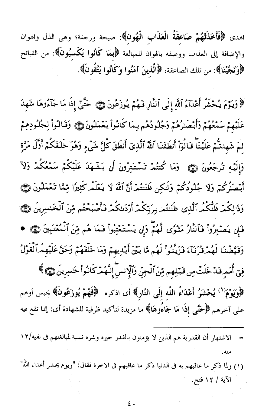 (وَيَوْمَ يُحْشَرُ أَعْدَاءُ اللهِ إِلَى النَّارِ فَهُمْ يُوزَعُونَ (19) حَتَّى إِذَا مَا جَاءُوهَا شَهِدَ عَلَيْهِمْ سَمْعُهُمْ وَأَبْصَارُهُمْ وَجُلُودُهُمْ بِمَا كَانُوا يَعْمَلُونَ (20) وَقَالُوا لِجُلُودِهِمْ لِمَ شَهِدْتُمْ عَلَيْنَا قَالُوا أَنْطَقَنَا اللهُ الَّذِي أَنْطَقَ كُلَّ شَيْءٍ وَهُوَ خَلَقَكُمْ أَوَّلَ مَرَّةٍ وَإِلَيْهِ تُرْجَعُونَ (21) وَمَا كُنْتُمْ تَسْتَتِرُونَ أَنْ يَشْهَدَ عَلَيْكُمْ سَمْعُكُمْ وَلَا أَبْصَارُكُمْ وَلَا جُلُودُكُمْ وَلَكِنْ ظَنَنْتُمْ أَنَّ اللهَ لَا يَعْلَمُ كَثِيرًا مِمَّا تَعْمَلُونَ (22) وَذَلِكُمْ ظَنُّكُمُ الَّذِي ظَنَنْتُمْ بِرَبِّكُمْ أَرْدَاكُمْ فَأَصْبَحْتُمْ مِنَ الْخَاسِرِينَ (23) فَإِنْ يَصْبِرُوا فَالنَّارُ مَثْوًى لَهُمْ وَإِنْ يَسْتَعْتِبُوا فَمَا هُمْ مِنَ الْمُعْتَبِينَ (24) وَقَيَّضْنَا لَهُمْ قُرَنَاءَ فَزَيَّنُوا لَهُمْ مَا بَيْنَ أَيْدِيهِمْ وَمَا خَلْفَهُمْ وَحَقَّ عَلَيْهِمُ الْقَوْلُ فِي أُمَمٍ قَدْ خَلَتْ مِنْ قَبْلِهِمْ مِنَ الْجِنِّ وَالْإِنْسِ إِنَّهُمْ كَانُوا خَاسِرِينَ (25)