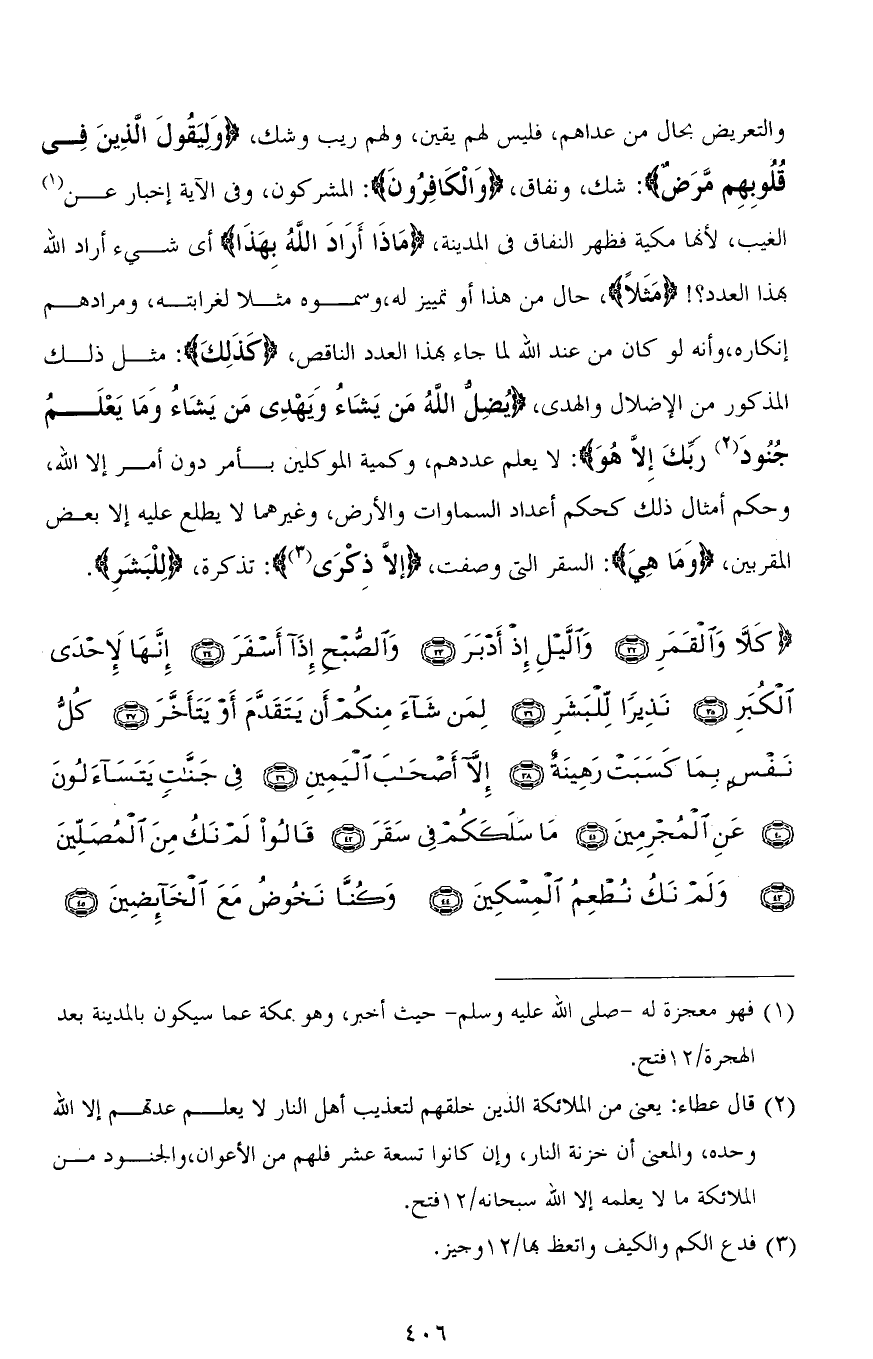 والتعريض بحال من عداهم، فليس لهم يقين، ولهم ريب وشك، (وَلِيَقُولَ الَّذِينَ فِي قُلُوبِهِمْ مَرَضٌ): شك، ونفاق، (وَالْكَافِرُونَ): المشركون، وفي الآية إخبار عن الغيب، لأنها مكية فظهر النفاق في المدينة، (مَاذَا أَرَادَ اللهُ بِهَذَا) أي شيء أراد الله بهذا العدد؟! (مَثَلًا)، حال من هذا أو تمييز له، وسموه مثلاً لغرابته، ومرادهم إنكاره، وأنه لو كان من عند الله لما جاء بهذا العدد الناقص، (كَذَلِكَ): مثل ذلك المذكور من الإضلال والهدى، (يُضِلُّ اللهُ مَنْ يَشَاءُ وَيَهْدِي مَنْ يَشَاءُ وَمَا يَعْلَمُ جُنُودَ رَبِّكَ إِلَّا هُوَ): لا يعلم عددهم، وكمية الموكلين بأمر دون أمر إلا الله، وحكم أمثال ذلك كحكم أعداد السماوات والأرض، وغيرهما لا يطلع عليه إلا بعض المقربين، (وَمَا هِيَ): السقر التي وصفت، (إِلَّا ذِكْرَى): تذكرة، (لِلْبَشَرِ).