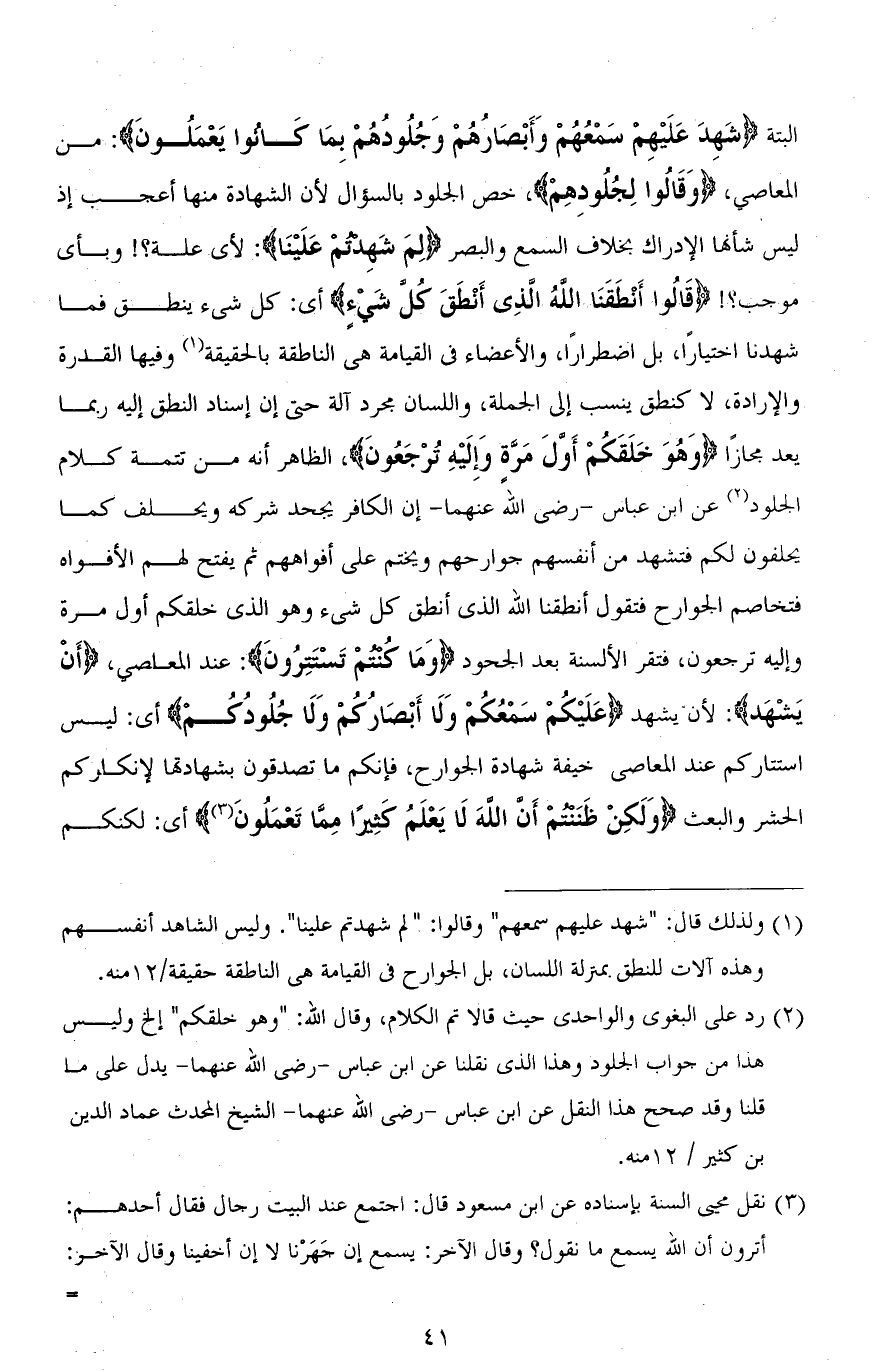ألبتَّة (شَهِدَ عَلَيْهِمْ سَمْعُهُمْ وَأَبْصَارُهُمْ وَجُلُونَُهُمْ بِمَا كَانُوا يَعْمَلُونَ): من المعاصي، (وَقَالُوا لِجُلُودِهِمْ)، خص الجلود بالسؤال لأن الشهادة منها أعجب إذ ليس شأنها الإدراك بخلاف السمع والبصر (لِمَ شَهِدْتُمْ عَلَيْنَا): لأي علة؟! وبأي موجب؟! (قَالُوا أَنْطَقَنَا اللهُ الَّذِي أَنْطَقَ كُلَّ شَيْءٍ) أي: كل شيء ينطق فما شهدنا اختيارًا، بل اضطرارًا، والأعضاء في القيامة هي الناطقة بالحقيقة وفيها القدرة والإرادة، لا كنطق ينسب إلى الجملة، واللسان مجرد آلة حتى إن إسناد النطق إليه ربما يعد مجازًا (وَهُوَ خَلَقَكُمْ أَوَّلَ مَرَّةٍ وَإِلَيْهِ تُرْجَعُونَ)، الظاهر أنه من تتمة كلام الجلود عن ابن عباس - رضي الله عنهما - إن الكافر يجحد شركه ويحلف كما يحلفون لكم فتشهد من أنفسهم جوارحهم ويختم على أفواههم ثم يفتح لهم الأفواه فتخاصم الجوارح فتقول أنطقنا الله الذي أنطق كل شيء وهو الذي خلقكم أول مرة وإليه ترجعون، فتقر الألسنة بعد الجحود (وَما كُنتمْ تَسْتَتِرُونَ): عند المعاصي، (أَنْ يَشْهَدَ): لأن يشهد (عَلَيْكُمْ سَمْعُكُمْ وَلَا أَبْصَارُكُمْ وَلَا جُلُودُكُمْ) أي: ليس استتاركم عند المعاصي خيفة شهادة الجوارح، فإنكم ما تصدقون بشهادتها لإنكاركم الحشر والبعث (وَلَكِنْ ظَنَنْتُمْ أَنَّ اللهَ لَا يَعْلَمُ كَثِيرًا مِمَّا تَعْمَلُونَ) أي: لكنكم