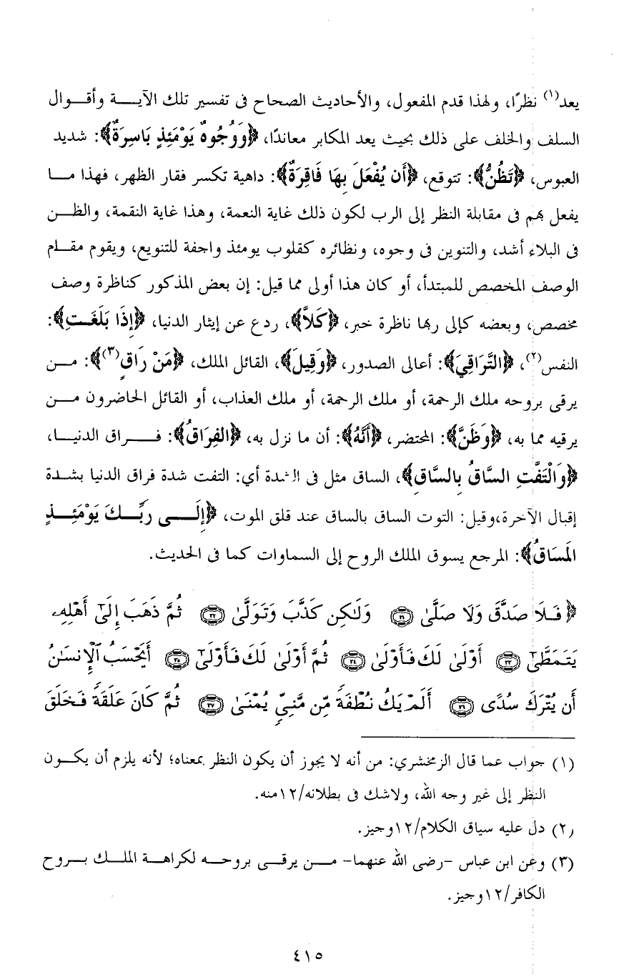 لا يعد نظرًا، ولهذا قدم المفعول، والأحاديت الصحاح في تفسير تلك الآية وأقوال السلف والخلف على ذلك بحيث يعد المكابر معاندًا، (وَوُجُوهٌ يَوْمَئِذٍ بَاسِرَةٌ): شديد العبوس، (تَظُنُّ): تتوقع، (أَن يُفْعَلَ بِهَا فَاقِرَةٌ): داهية تكسر فقار الظهر، فهذا ما يفعل بهم في مقابلة النظر إلى الرب لكون ذلك غاية النعمة، وهذا غاية النقمة، والظن فى البلاء أشد، والتنوين في وجوه، ونظائره كـ قلوب يومئذ واجفة للتنويع، ويقوم مقام الوصف المخصص للمبتدأ، أو كان هذا أولى مما قيل: إن بعض المذكور كناظرة وصف مخصص، وبعضه كـ إلى ربها ناظرة خبر، (كَلاَّ)، ردع عن إيثار الدنيا، (إِذا بَلَغَتِ): النفس، (التَّرَاقِيَ): أعالي الصدور، (وَقِيلَ)، القائل الملك، (مَنْ رَاقٍ): من يرقى بروحه ملك الرحمة، أو ملك الرحمة، أو ملك العذاب، أو القائل الحاضرون من يرقيه مما به، (وَظَنَّ): المحتضر، (أنَّهُ): أن ما نزل به، (الفِرَاقُ): فراق الدنيا، (وَالْتَفَّتِ السَّاقُ بِالسَّاقِ)، الساق مثل في الشدة أي: التفت شدة فراق الدنيا بشدة إقبال الآخرة، وقيل: التوت الساق بالساق عند قلق الموت، (إِلَى رَبِّكَ يَوْمَئِذٍ الْمَسَاقُ): المرجع يسوق الملك الروح إلى السماوات كما في الحديث.