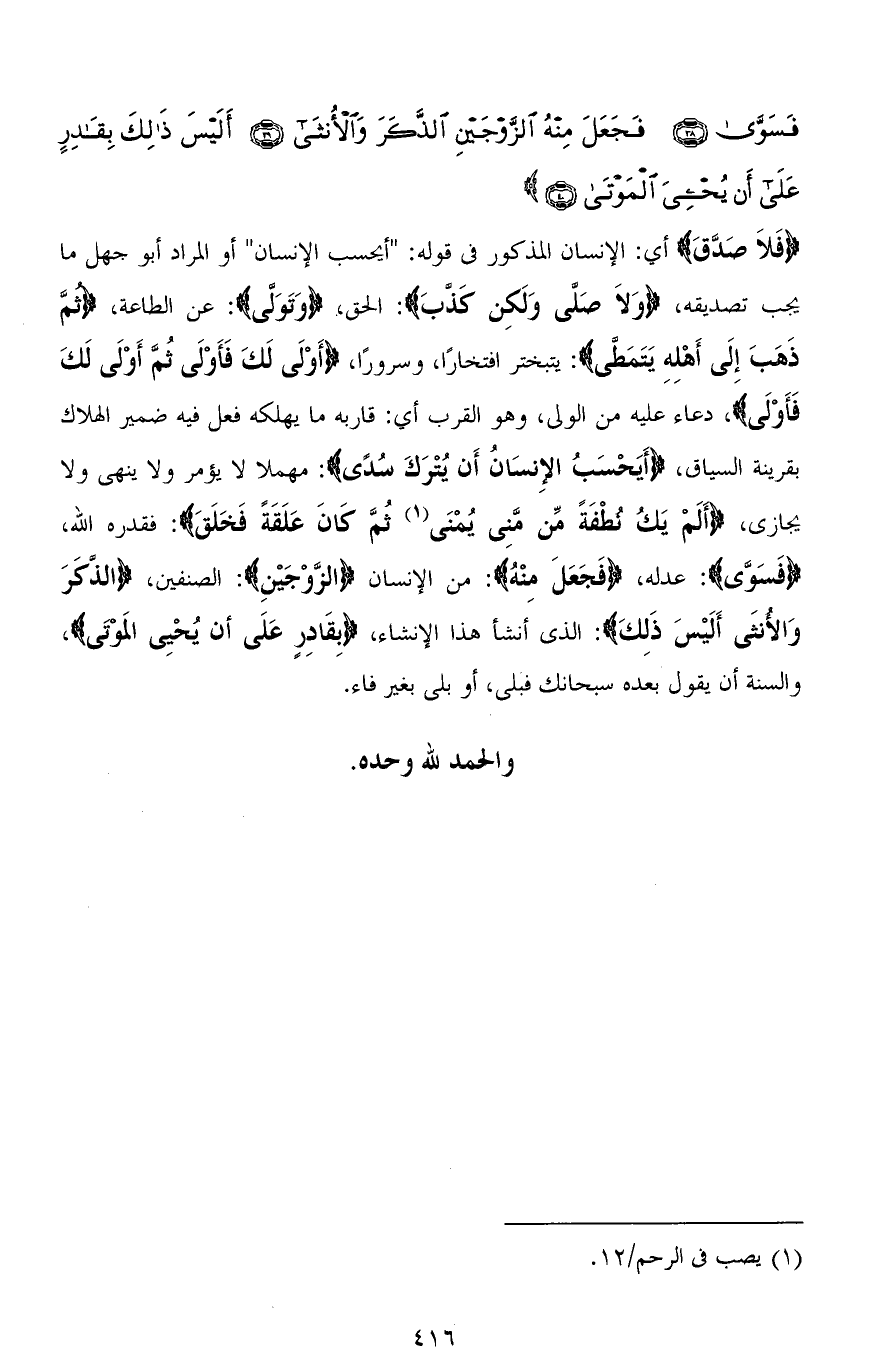 (فَلاَ صَدَّقَ) أي: الإنسان المذكور في قوله: " أيحسب الإنسان " أو المراد أبو جهل ما يجب تصديقه، (وَلَا صَلَّى وَلَكِنْ كَذَّبَ): الحق،، (وَتَوَلَّى): عن الطاعة، (ثُمَّ ذَهَبَ إِلَى أَهْلِهِ يَتَمَطَّى): يتبختر افتخارًا، وسرورًا، (أَوْلَى لَكَ فَأَوْلَى ثُمَّ أَوْلَى لَكَ فَأَوْلَى)، دعاء عليه من الولى، وهو القرب أي: قاربه ما يهلكه فعل فيه ضمير الهلاك بقرينة السياق، (أَيَحْسَبُ الْإِنْسَانُ أَنْ يُتْرَكَ سُدًى): مهملاً لا يؤمر ولا ينهى ولا يجازى، (أَلَمْ يَكُ نُطْفَةً مِنْ مَنِيٍّ يُمْنَى ثُمَّ كَانَ عَلَقَةً فَخَلَقَ): فقدره الله، (فَسَوَّى): عدله، (فَجَعَلَ مِنْهُ): من الإنسان (الزَّوْجَيْنِ): الصنفين، (الذَّكَرَ وَالْأُنْثَى أَلَيْسَ ذَلِكَ): الذي أنشأ هذا الإنشاء، (بِقَادِرٍ عَلَى أَنْ يُحْيِيَ الْمَوْتَى)، والسنة أن يقول بعده سبحانك فَبَلى، أو بلى بغير فاء.