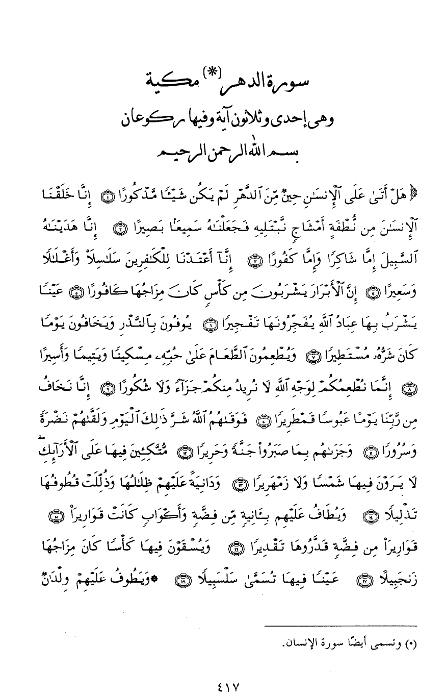 هَلْ أَتَى عَلَى الْإِنْسَانِ حِينٌ مِنَ الدَّهْرِ لَمْ يَكُنْ شَيْئًا مَذْكُورًا (1) إِنَّا خَلَقْنَا الْإِنْسَانَ مِنْ نُطْفَةٍ أَمْشَاجٍ نَبْتَلِيهِ فَجَعَلْنَاهُ سَمِيعًا بَصِيرًا (2) إِنَّا هَدَيْنَاهُ السَّبِيلَ إِمَّا شَاكِرًا وَإِمَّا كَفُورًا (3) إِنَّا أَعْتَدْنَا لِلْكَافِرِينَ سَلَاسِلَ وَأَغْلَالًا وَسَعِيرًا (4) إِنَّ الْأَبْرَارَ يَشْرَبُونَ مِنْ كَأْسٍ كَانَ مِزَاجُهَا كَافُورًا (5) عَيْنًا يَشْرَبُ بِهَا عِبَادُ اللهِ يُفَجِّرُونَهَا تَفْجِيرًا (6) يُوفُونَ بِالنَّذْرِ وَيَخَافُونَ يَوْمًا كَانَ شَرُّهُ مُسْتَطِيرًا (7) وَيُطْعِمُونَ الطَّعَامَ عَلَى حُبِّهِ مِسْكِينًا وَيَتِيمًا وَأَسِيرًا (8) إِنَّمَا نُطْعِمُكُمْ لِوَجْهِ اللهِ لَا نُرِيدُ مِنْكُمْ جَزَاءً وَلَا شُكُورًا (9) إِنَّا نَخَافُ مِنْ رَبِّنَا يَوْمًا عَبُوسًا قَمْطَرِيرًا (10) فَوَقَاهُمُ اللهُ شَرَّ ذَلِكَ الْيَوْمِ وَلَقَّاهُمْ نَضْرَةً وَسُرُورًا (11) وَجَزَاهُمْ بِمَا صَبَرُوا جَنَّةً وَحَرِيرًا (12) مُتَّكِئِينَ فِيهَا عَلَى الْأَرَائِكِ لَا يَرَوْنَ فِيهَا شَمْسًا وَلَا زَمْهَرِيرًا (13) وَدَانِيَةً عَلَيْهِمْ ظِلَالُهَا وَذُلِّلَتْ قُطُوفُهَا تَذْلِيلًا (14) وَيُطَافُ عَلَيْهِمْ بِآنِيَةٍ مِنْ فِضَّةٍ وَأَكْوَابٍ كَانَتْ قَوَارِيرَا (15) قَوَارِيرَ مِنْ فِضَّةٍ قَدَّرُوهَا تَقْدِيرًا (16) وَيُسْقَوْنَ فِيهَا كَأْسًا كَانَ مِزَاجُهَا زَنْجَبِيلًا (17) عَيْنًا فِيهَا تُسَمَّى سَلْسَبِيلًا (18) وَيَطُوفُ عَلَيْهِمْ وِلْدَانٌ