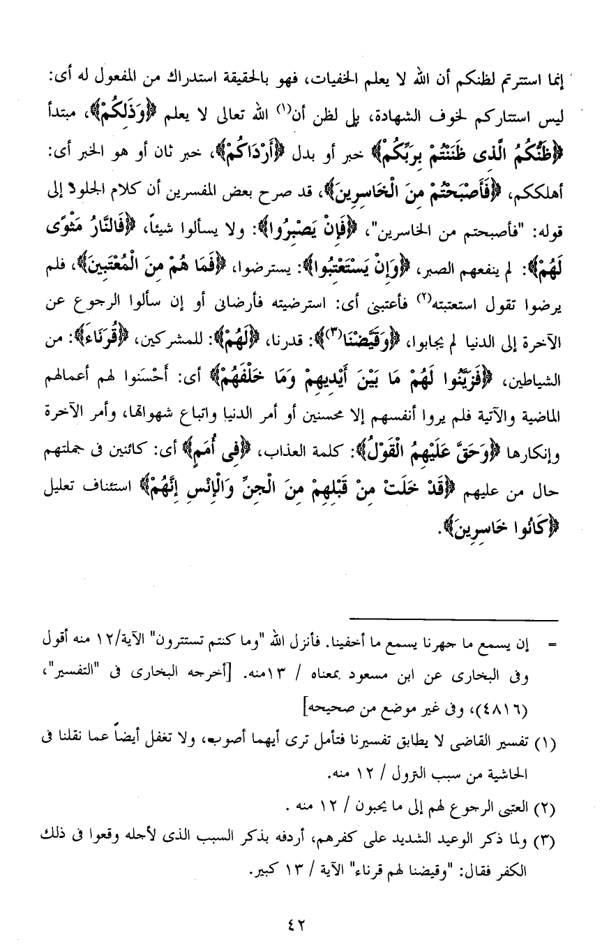 إنما استترتم لظنكم أن الله لا يعلم الخفيات، فهو بالحقيقة استدراك من المفعول له أي: ليس استتاركم لخوف الشهادة، بل لظن أن الله تعالى لا يعلم (وَذلِكُمْ)، مبتدأ (ظَنُّكُمُ الَّذِي ظَنَنْتُمْ بِرَبِّكُمْ) خبر أو بدل (أَرْدَاكُمْ)، خبر ثان أو هو الخبر أي: أهلككم، (فَأَصْبَحْتُمْ مِنَ الْخَاسِرِينَ)، قد صرح بعض المفسرين أن كلام الجلود إلى قوله: (فَأَصْبَحْتُمْ مِنَ الْخَاسِرِينَ)، (فَإِنْ يَصْبِرُوا): ولا يسألوا شيئًا، (فَالنَّارُ مَثْوًى لَهُمْ): لم ينفعهم الصبر، (وَإِنْ يَسْتَعْتِبُوا): يسترضوا، (فَمَا هُمْ مِنَ الْمُعْتَبِينَ)، فلم يرضوا تقول استعتبته فأعتبني أي: استرضيته فأرضاني أو إن سألوا الرجوع عن الآخرة إلى الدنيا لم يجابوا، (وَقَيَّضْنَا): قدرنا، (لَهُمْ): للمشركين، (قُرَنَاءَ): من الشياطين، (فَزَيَّنُوا لَهُمْ مَا بَيْنَ أَيْدِيهِمْ وَمَا خَلْفَهُمْ) أي: أحْسَنوا لهم أعمالهم الماضية والآتية فلم يروا أنفسهم إلا محسنين أو أمر الدنيا واتباع شهواتها، وأمر الآخرة وإنكارها (وَحَقَّ عَلَيْهِمُ الْقَوْلُ): كلمة العذاب، (فِي أُمَمٍ) أي: كائنين في جملتهم حال من عليهم (قَدْ خَلَتْ مِنْ قَبْلِهِمْ مِنَ الْجِنِّ وَالْإِنْسِ إِنَّهُمْ) استئناف تعليل (كَانُوا خَاسِرِينَ).