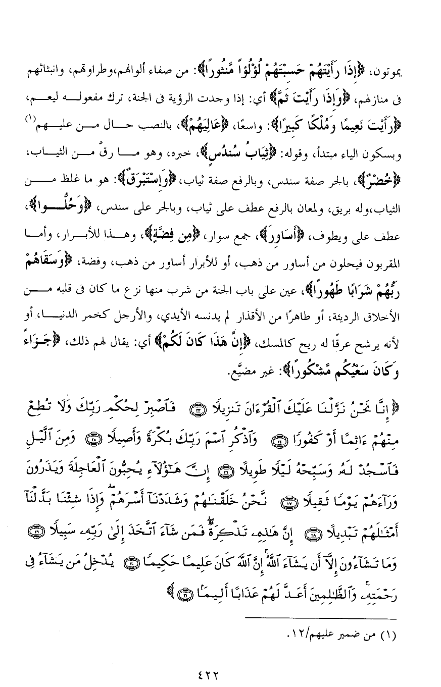 (إِنَّا نَحْنُ نَزَّلْنَا عَلَيْكَ الْقُرْآنَ تَنْزِيلًا (23) فَاصْبِرْ لِحُكْمِ رَبِّكَ وَلَا تُطِعْ مِنْهُمْ آثِمًا أَوْ كَفُورًا (24) وَاذْكُرِ اسْمَ رَبِّكَ بُكْرَةً وَأَصِيلًا (25) وَمِنَ اللَّيْلِ فَاسْجُدْ لَهُ وَسَبِّحْهُ لَيْلًا طَوِيلًا (26) إِنَّ هَؤُلَاءِ يُحِبُّونَ الْعَاجِلَةَ وَيَذَرُونَ وَرَاءَهُمْ يَوْمًا ثَقِيلًا (27) نَحْنُ خَلَقْنَاهُمْ وَشَدَدْنَا أَسْرَهُمْ وَإِذَا شِئْنَا بَدَّلْنَا أَمْثَالَهُمْ تَبْدِيلًا (28) إِنَّ هَذِهِ تَذْكِرَةٌ فَمَنْ شَاءَ اتَّخَذَ إِلَى رَبِّهِ سَبِيلًا (29) وَمَا تَشَاءُونَ إِلَّا أَنْ يَشَاءَ اللهُ إِنَّ اللهَ كَانَ عَلِيمًا حَكِيمًا (30) يُدْخِلُ مَنْ يَشَاءُ فِي رَحْمَتِهِ وَالظَّالِمِينَ أَعَدَّ لَهُمْ عَذَابًا أَلِيمًا (31)