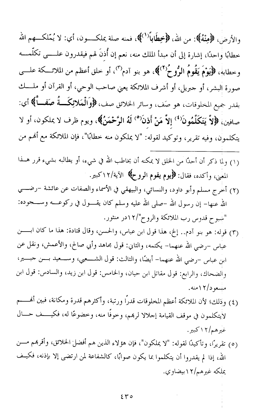 والأرض، (مِنْهُ): من الله، (خِطَابًا)، فمنه صلة يملكون، أي: لا يُمّلكهم الله خطابًا واحدًا، إشارة إلى أن مبدأ الملك منه، نعم إن أُذِنَ لهم فيقدرون على تكلّمه وخطابه، (يَوْمَ يَقُومُ الرُّوحُ)، هو بنو آدم، أو خلق أعظم من الملائكة على صورة البشر، أو جبريل، أو أشرف الملائكة يعني صاحب الوحي، أو القرآن أو ملك بقدر جمع المخلوقات، هو صنف، وسائر الخلائق صف، (وَالْمَلائِكَةُ صَفًّا) أي: صافين، (لَا يَتَكَلَّمُونَ إِلَّا مَنْ أَذِنَ لَهُ الرَّحْمَنُ)، ويوم ظرف لا يملكون، أو لا يتكلمون، وفيه تقرير، وتوكيد لقوله: " لا يملكون منه خطابًا "، فإن الملائكة مع أنَّهم من