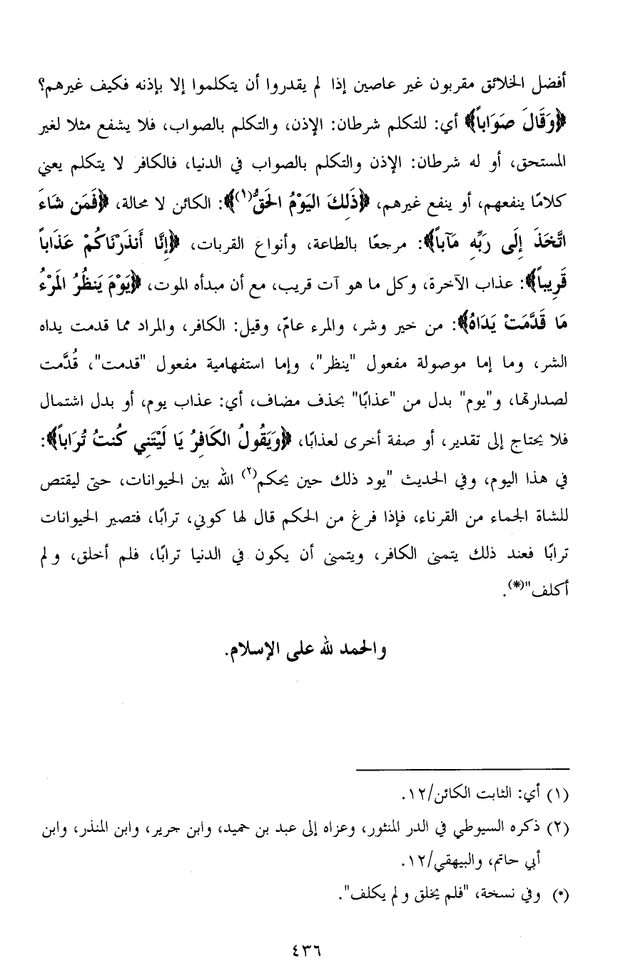 (وَقَالَ صَوَابًا) أي: للتكلم شرطان: الإذن، والتكلم بالصواب، فلا يشفع مثلاً لغير المستحق، أو له شرطان: الإذن والتكلم بالصواب في الدنيا، فالكافر لا يتكلم يعني كلامًا ينفعهم، أو ينفع غيرهم، (ذَلِكَ اليَوْمُ الحَقُّ): الكائن لا محالة، (فَمَنْ شَاءَ اتَّخَذَ إِلَى رَبِّهِ مَآبًا): مرجعًا بالطاعة، وأنواع القربات، (إِنَّا أَنْذَرْنَاكُمْ عَذَابًا قَرِيبًا): عذاب الآخرة، وكل ما هو آت قريب، مع أن مبدأه الموت، (يَوْمَ يَنْظُرُ الْمَرْءُ مَا قَدَّمَتْ يَدَاهُ): من خير وشر، والمرء عامٌّ، وقيل: الكافر، والمراد مما قدمت يداه الشر، وما إما موصولة مفعول " ينظر "، وإما استفهامية مفعول " قدمت "، قُدَّمت لصدارتها، و " يوم " بدل من " عذابًا " بحذف مضاف، أي: عذاب يوم، أو بدل اشتمال فلا يحتاج إلى تقدير، أو صفة أخرى لـ عذابًا، (وَيَقُولُ الْكَافِرُ يَا لَيْتَنِي كُنْتُ تُرَابًا): في هذا اليوم، وفي الحديث " يود ذلك حين يحكم الله بين الحيوانات، حتى ليقتص للشاة الجماء من القرناء، فإذا فرغ من الحكم قال لها كوني، ترابًا، فتصير الحيوانات ترابًا فعند ذلك يتمني الكافر، ويتمني أن يكون في الدنيا ترابًا، فلم أخلق، ولم أكلف ".