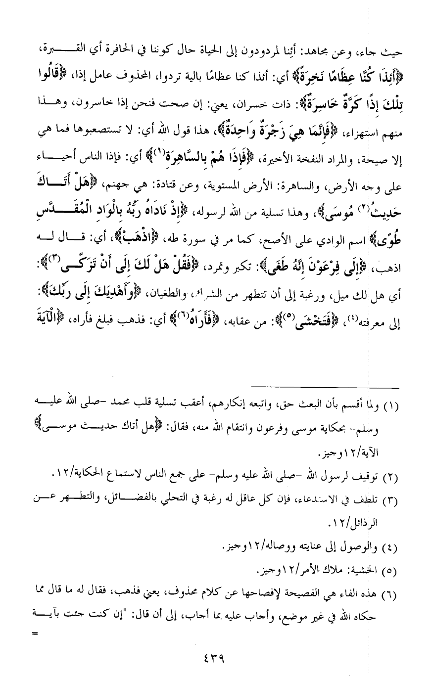 حيث جاء، وعن مجاهد: أئِنا لمردودون إلى الحياة حال كوننا في الحافرة أي القبرة، (أَإِذَا كُنَّا عِظَامًا نَخِرَةً) أي: أئذا كنا عظامًا بالية تردوا، المحذوف عامل إذا، (قَالُوا تِلْكَ إِذًا كَرَّةٌ خَاسِرَةٌ): ذات خسران، يعني: إن صحت فنحن إذا خاسرون، وهذا منهم استهزاء، (فَإِنَّمَا هِيَ زَجْرَةٌ وَاحِدَةٌ)، هذا قول الله أي: لا تستصعبوها فما هيِ إلا صيحة، والمراد النفخة الأخيرة، (فَإِذَا هُمْ بِالسَّاهِرَةِ) أي: فإذا الناس أحياء على وجه الأرض، والساهرة: الأرض المستوية، وعن قتادة: هي جهنم، (هَلْ أَتَاكَ حَدِيثُ مُوسَى)، وهذا تسلية من الله لرسوله، (إِذْ نَادَاهُ ربهُ بالْوَادِ الْمُقَدَّسِ طوًى) اسم الوادي على الأصح، كما مر في سورة طه، (اذْهَبْ)، أي: قال له اذهب، (إِلَى فِرْعَوْنَ إِنَّهُ طَغَى): تكبر وتمرد، (فَقُلْ هَلْ لَكَ إِلَى أَنْ تَزَكَّى): أي هل لك ميل، ورغبة إلى أن تتطهر من الشرك، والطغيان، (وَأَهْدِيَكَ إِلَى رَبِّكَ): إلى معرفته، (فَتَخْشَى): من عقابه، (فَأَرَاهُ) أي: فذهب فبلغ فأراه، (الْآيَةَ