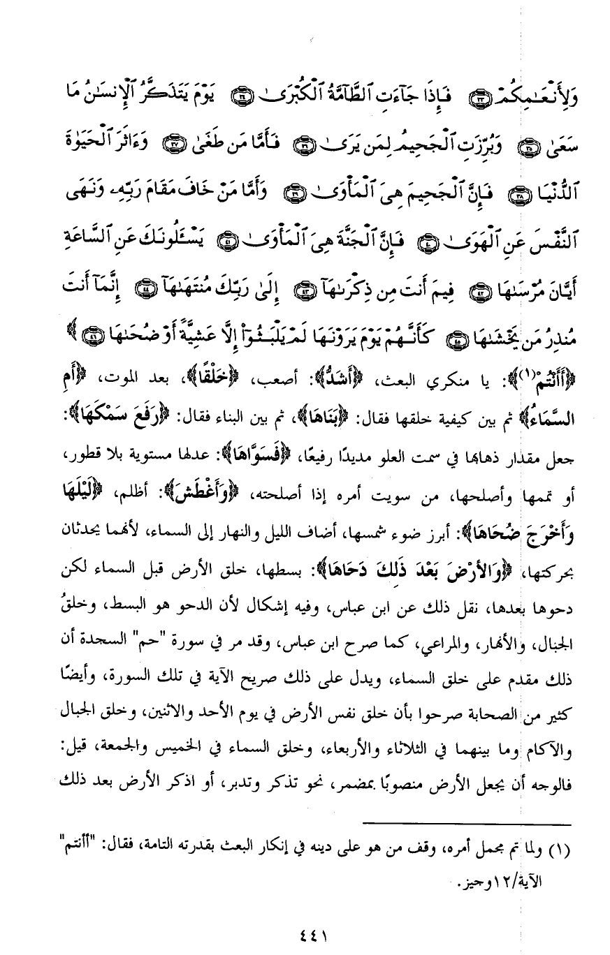 (أَأَنْتُمْ): يا منكرى البعث، (أَشَدُّ): أصعب، (خَلْقًا)، بعد الموت، (أَمِ السَّمَاءُ) ثم بين كيفية خلقها فقال: (بَنَاهَا)، ثم بين البناء فقال: (رَفَعَ سَمْكَهَا): جعل مقدار ذهابها في سمت العلو مديدًا رفيعًا، (فَسَوَّاهَا): عدلها مستوية بلا قطور، أو تممها وأصلحها، من سويت أمره إذا أصلحته، (وَأَغْطَشَ): أظلم، (لَيْلَهَا وَأَخْرَجَ ضُحَاهَا): أبرز ضوء شمسها، أضاف الليل والنهار إلى السماء، لأنهما يحدثان بحركتها، (وَالْأَرْضَ بَعْدَ ذَلِكَ دَحَاهَا): بسطها، خلق الأرض قبل السماء لكن دحوها بعدها، نقل ذلك عن ابن عباس، وفيه إشكال لأن الدحو هو البسط، وخلقُ الجبال، والأنهار، والمراعي، كما صرح ابن عباس، وقد مر في سورة " حم " السجدة أن ذلك مقدم على خلق السماء، ويدل على ذلك صريح الآية في تلك السورة، وأيضًا كثير من الصحابة صرحوا بأن خلق نفس الأرض في يوم الأحد والاثنين، وخلق الجبال والآكام وما بينهما في الثلائاء والأربعاء، وخلق السماء في الخميس والجمعة، قيل: فالوجه أن يجعل الأرض منصوبًا بمضمر، نحو تذكر وتدبر، أو اذكر الأرض بعد ذلك