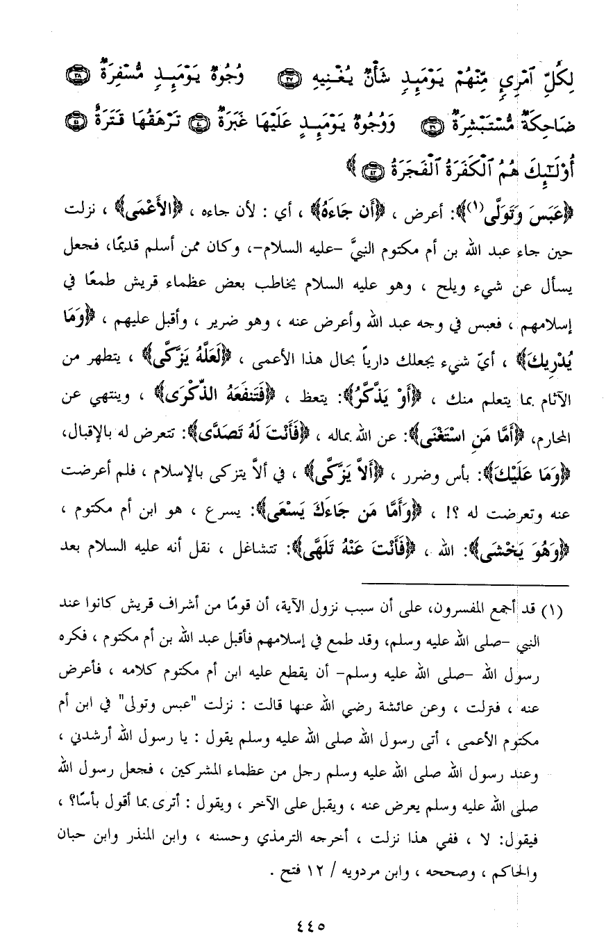 (عَبَسَ وَتَوَلَّى): أعرض، (أَن جَاءَهُ)، أي: لأن جاءه، (الأَعْمَى)، نزلت حين جاء عبد الله بن أم مكتوم النبيَّ - عليه السلام -، وكان ممن أسلم قديمًا، فجعل يسأل عن شيء ويلح، وهو عليه السلام يخاطب بعض عظماء قريش طمعًا في إسلامهم، فعبس في وجه عبد الله وأعرض عنه، وهو ضرير، وأقبل عليهم، (وَمَا يُدْرِيكَ)، أيُّ شيء يجعلك داريًا بحال هذا الأعمى، (لَعَلَّهُ يَزَّكَّى)، يتطهر من الآثام بما يتعلم منك، (أَوْ يَذَّكَّرُ): يتعظ، (فَتَنْفَعَهُ الذِّكْرَى)، وينتهي عن المحارم، (أَمَّا مَنِ اسْتَغْنَى): عن الله بماله، (فَأَنْتَ لَهُ تَصَدَّى): تتعرض له بالإقبال، (وَمَا عَلَيْكَ): بأس وضرر، (أَلَّا يَزَّكَّى)، في ألا يتزكى بالإسلام، فلم أعرضت عنه وتعرضت له؟!، (وَأَمَّا مَنْ جَاءَكَ يَسْعَى): يسرع، هو ابن أم مكتوم، (وَهُوَ يَخْشَى): الله، (فَأَنْتَ عَنْهُ تَلَهَّى): تتشاغل، نقل أنه عليه السلام بعد