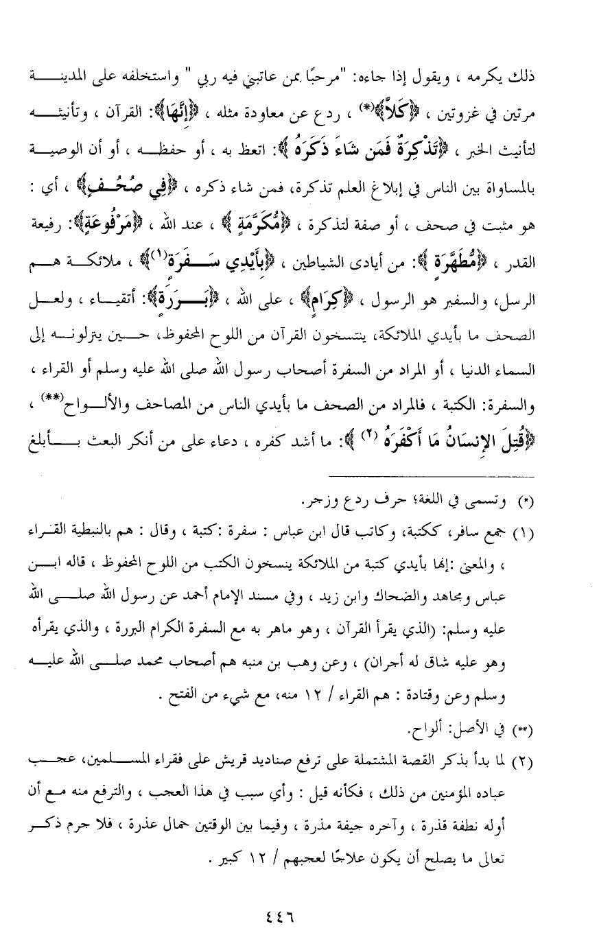 ذلك يكرمه، ويقول إذا جاءه: " مرحبًا بمن عاتبني فيه ربي " واستخلفه على المدينة مرتين في غزوتين، (كَلَّا)، ردع عن معاودة مثله، (إِنَّهَا): القرآن، وتأنيثه لتأنيث الخبر، (تَذْكِرَةٌ فمَن شَاءَ ذَكَرَهُ): اتعظ به، أو حفظه، أو أن الوصية بالمساواة بين الناس في إبلاغ العلم تذكرة، فمن شاء ذكره، (فِي صُحُفٍ)، أي: هو مثبت في صحف، أو صفة لـ تذكرة، (مُكَرَّمَةٍ)، عند الله، (مَرْفُوعَةٍ): رفيعة القدر، (مُطَهَّرَةٍ): من أيادى الشياطين، (بِأَيْدِي سَفَرَةٍ)، ملائكة هم الرسل، والسفير هو الرسول، (كِرَامٍ)، على الله، (بَرَرَةٍ): أتقياء، ولعل الصحف ما بأيدي الملائكة، ينتسخون القرآن من اللوح المحفوظ، حين ينزلونه إلى السماء الدنيا، أو المراد من السفرة أصحاب رسول الله صلى الله عليه وسلم أو القراء، والسفرة: الكتبة، فالمراد من الصحف ما بأيدي الناس من المصاحف والألواح، (قُتِلَ الْإِنْسَانُ مَا أَكْفَرَهُ): ما أشد كفره، دعاء على من أنكر البعث بأبلغ
