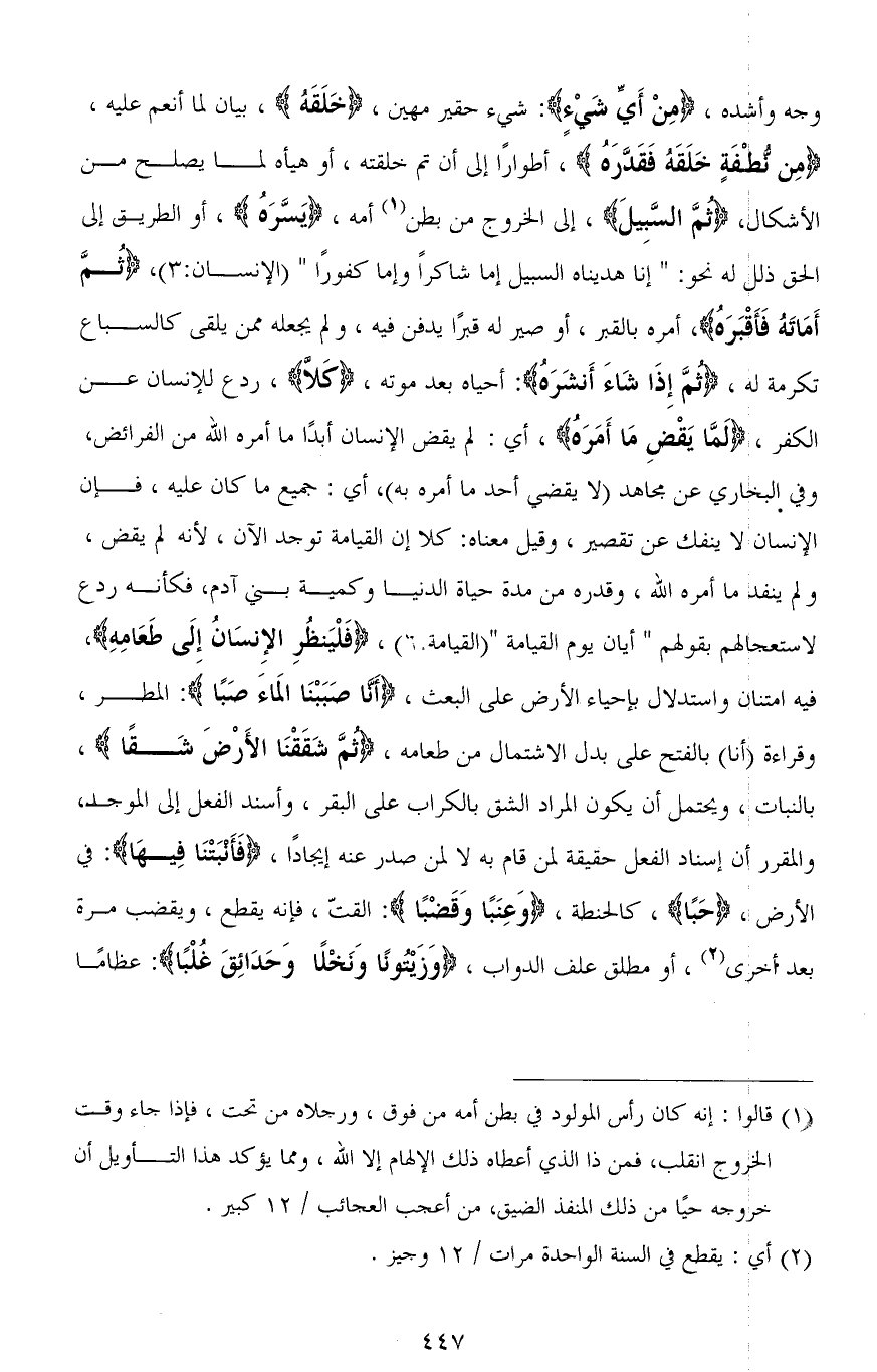 وجه وأشده، (مِنْ أَيِّ شَيْءٍ): شيء حقير مهين، (خَلَقَهُ)، بيان لا أنعم عليه، (مِنْ نُطْفَةٍ خَلَقَهُ فَقَدَّرَهُ)، أطوارًا إلى أن تم خلقته، أو هيأه لما يصلح من الأشكال، (ثُمَّ السَّبِيلَ)، إلى الخروج من بطن أمه، (يَسَّرَهُ)، أو الطريق إلى الحق ذلل له نحو: " إنا هديناه السبيل إما شاكرًا وإما كفورًا " [الإنسان: 3]، (ثُمَّ أَمَاتَهُ فَأَقْبَرَهُ)، أمره بالقبر، أو صير له قبرًا يدفن فيه، ولم يجعله ممن يلقى كالسباع تكرمة له، (ثُمَّ إِذَا شَاءَ أَنْشَرَهُ): أحياه بعد موته، (كَلَّا)، ردع للإنسان عن الكفر، (لَمَّا يَقْضِ مَا أَمَرَهُ)، أي: لم يقض الإنسان أبدًا ما أمره الله من الفرائض، وفي البخاري عن مجاهد " لا يقضي أحد ما أمره به "، أي: جميع ما كان عليه، فإن الإنسان لا ينفك عن تقصير، وقيل معناه: كلا إن القيامة توجد الآن، لأنه لم يقض، ولم ينفذ ما أمره الله، وقدره من مدة حياة الدنيا وكمية بني آدم، فكأنه ردع لاستعجالهم بقولهم " أيان يوم القيامة " [القيامة: 6]، (فَلْيَنْظُرِ الْإِنْسَانُ إِلَى طَعَامِهِ)، فيه امتنان واستدلال بإحياء الأرض على البعث، (أَنَّا صَبَبْنَا الْمَاءَ صَبًّا): المطر، وقراءة (أَنَّا) بالفتح على بدل الاشتمال من طعامه، (ثُمَّ شَقَقْنَا الْأَرْضَ شَقًّا)، بالنبات، ويحتمل أن يكون المراد الشق بالكراب على البقر، وأسند الفعل إلى الموجد، والمقرر أن إسناد الفعل حقيقة لمن قام به لا لمن صدر عنه إيجادًا، (فَأَنْبَتْنَا فِيهَا): في الأرض، (حَبًّا)، كالحنطة، (وَعِنَبًا وَقَضْبًا): القتّ، فإنه يقطع، ويقضب مرة بعد أخرى، أو مطلق علف الدواب، (وَزَيْتُونًا وَنَخْلًا وَحَدَائِقَ غُلْبًا): عامًا
