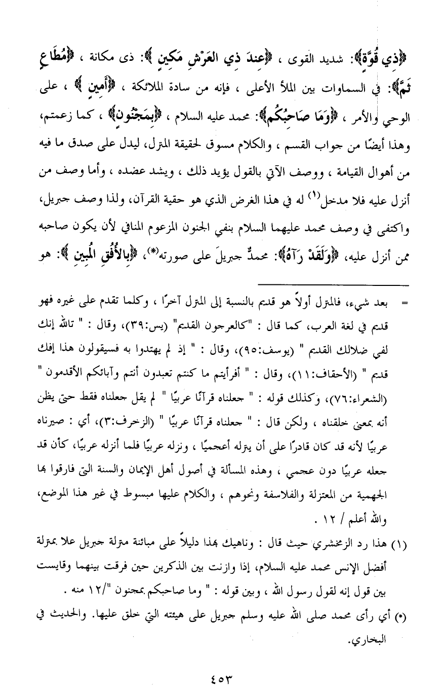 (ذي قُوَّة): شديد القوى، (عِندَ ذِي العَرْشِ مَكِين): ذي مكانة، (مُطَاعٍ ثَمَّ): في السماوات بين الملأ الأعلى، فإنه من سادة الملائكة، (أَمِينٍ)، على الوحي والأمر، (وَمَا صَاحِبُكُم): محمد عليه السلام، (بِمَجنونٍ)، كما زعمتم، وهذا أيضًا من جواب القسم، والكلام مسوق لحقيقة المنزل، ليدل على صدق ما فيه من أهوال القيامة، ووصف الآتي بالقول يؤيد ذلك، ويشد عضده، وأما وصف من أنزل عليه فلا مدخل له في هذا الغرض الذي هو حقية القرآن، ولذا وصف جبريل، واكتفى في وصف محمد عليهما السلام بنفي الجنون المزعوم المنافي لأن يكون صاحبه ممن أنزل عليه، (وَلَقَدْ رَآهُ): محمدٌّ جبريلَ على صورته، (بِالْأُفُقِ الْمُبِينِ): هو