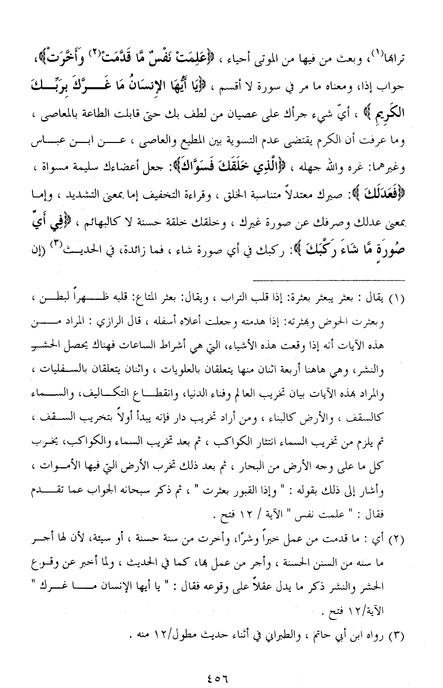 ترابها، وبعث من فيها من الموتى أحياء، (عَلِمَتْ نَفْسٌ مَا قَدَّمَتْ وَأَخَّرَتْ)، جواب إذا، ومعناه ما مر في سورة لا أقسم، (يَا أَيُّهَا الإِنسَانُ مَا غَرَّكَ بِرَبِّكَ الكَرِيمِ)، أيّ شيء جرأك على عصيان من لطف بك حتى قابلت الطاعة بالمعاصي، وما عرفت أن الكرم يقتضي عدم التسوية بين المطيع والعاصي، عن ابن عباس وغيرهما: غرَّه واللهِ جهلُه، (الَّذِي خَلَقَكَ فَسَوَّاكَ): جعل أعضاءك سليمة مسواة، [(فعَدَّلَكَ)]: صيرك معتدلاً متناسبة الخلق، وقراءة التخفيف إما بمعنى التشديد، وإما بمعنى عدلك وصرفك عن صورة غيرك، وخلقك خلقة حسنة لا كالبهائم، (فِي أَيِّ صُورَةٍ مَا شَاءَ رَكَّبَكَ): ركبك في أي صورة شاء، فما زائدة، في الحديث (إن
