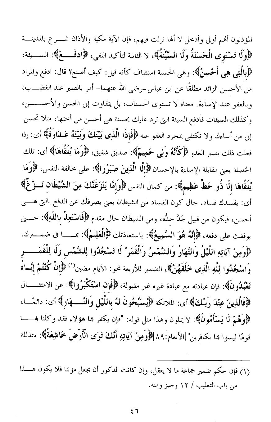 المؤذنون أنَّهم أولى وأدخل لا أنها نزلت فيهم، فإن الآية مكية والأذان شرع بالمدينة (وَلَا تَسْتَوِي الْحَسَنَةُ وَلَا السَّيِّئَةُ)، لا الثانية لتأكيد النفي، (ادفَعْ): السيئة، (بِالَّتِي هِيَ أَحْسَنُ): وهي الحسنة استئناف كأنه قيل: كيف أصنع؟ قال: ادفع والمراد من الأحسن الزائد مطلقًا عن ابن عباس - رضي الله عنهما - أمر بالصبر عند الغضب، وبالعفو عند الإساءة. معناه لا تستوي الحسنات، بل يتفاوت إلى الحسن والأحسن، وكذلك السيئات فادفع السيئة التي ترد عليك بحسنة هي أحسن من أختها، مثلاً تحسن إلى من أساءك ولا تكتفي بمجرد العفو عنه (فَإذَا الَّذِي بَيْنَكَ وَبَيْنَهُ عَدَاوَةٌ) أي: إذا فعلت ذلك يصير العدو (كَأَنَّهُ وَلِيٌّ حَمِيمٌ): صديق شفيق، (وَمَا يُلَقَّاهَا) أي: تلك الخصلة يعني مقابلة الإساءة بالإحسان (إِلَّا الَّذِينَ صَبَرُوا): على مخالفة النفس، (وَمَا يُلَقَّاهَا إِلَّا ذُو حَظٍّ عَظِيمٍ): من كمال النفس (وَإِمَّا يَنْزَغَنَّكَ مِنَ الشَّيْطَانِ نَزْغٌ) أى: يفسدك فساد. حال كون الفساد من الشيطان يعني يصرفك عن الدفع بالتي هي أحسن، فيكون من قبيل جَدَّ جِدُّه، ومن الشيطان حال مقدم (فَاسْتَعِذْ بِاللهِ): حتى يوفقك على دفعه، (إِنَّهُ هُوَ السَّمِيعُ): باستعاذتك (الْعَلِيمُ): بما في ضميرك، (وَمِنْ آيَاتِهِ اللَّيْلُ وَالنَّهَارُ وَالشَّمْسُ وَالْقَمَرُ لَا تَسْجُدُوا لِلشَّمْسِ وَلَا لِلْقَمَرِ وَاسْجُدُوا لله الَّذِي خَلَقَهُنَّ)، الضمير للأربعة نحو: الأيام مضين (إِنْ كُنْتُمْ إِيَّاهُ تَعْبُدُونَ): فإن عبادته مع عبادة غيره غير مقبولة، (فَإِنِ اسْتَكْبَرُوا): عن الامتثال (فَالَّذِينَ عِنْدَ رَبِّكَ) أي: الملائكة (يُسَبِّحُونَ لَهُ بِاللَّيْلِ وَالنَّهَارِ) أي: دائمًا، (وَهُمْ لَا يَسْأَمُونَ): لا يملون وهذا مثل قوله: (فَإِنْ يَكْفُرْ بِهَا هَؤُلَاءِ فَقَدْ وَكَّلْنَا بِهَا قَوْمًا لَيْسُوا بِهَا بِكَافِرِينَ) [الأنعام: 89] (وَمِنْ آيَاتِهِ أَنَّكَ تَرَى الْأَرْضَ خَاشِعَةً): متذللة